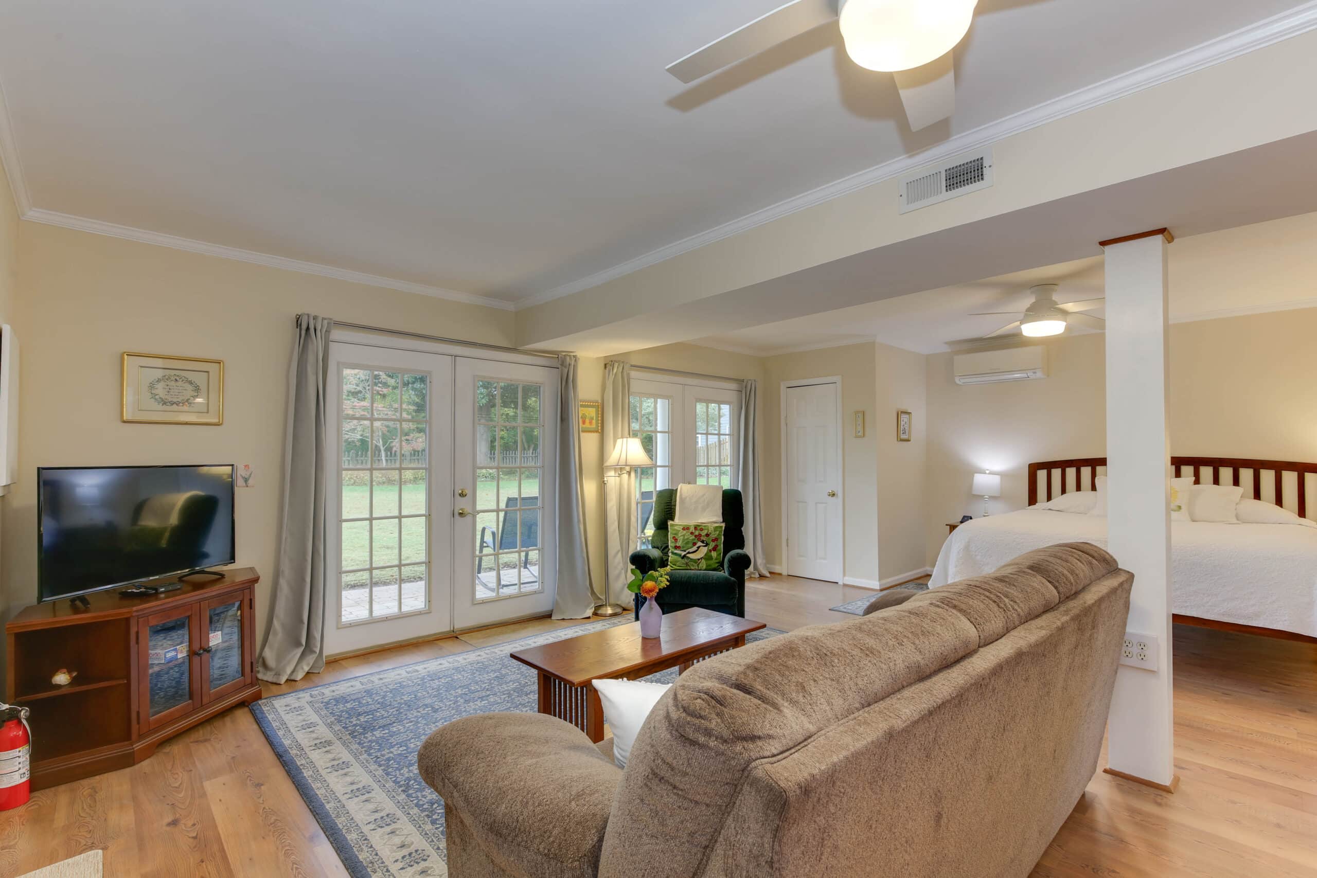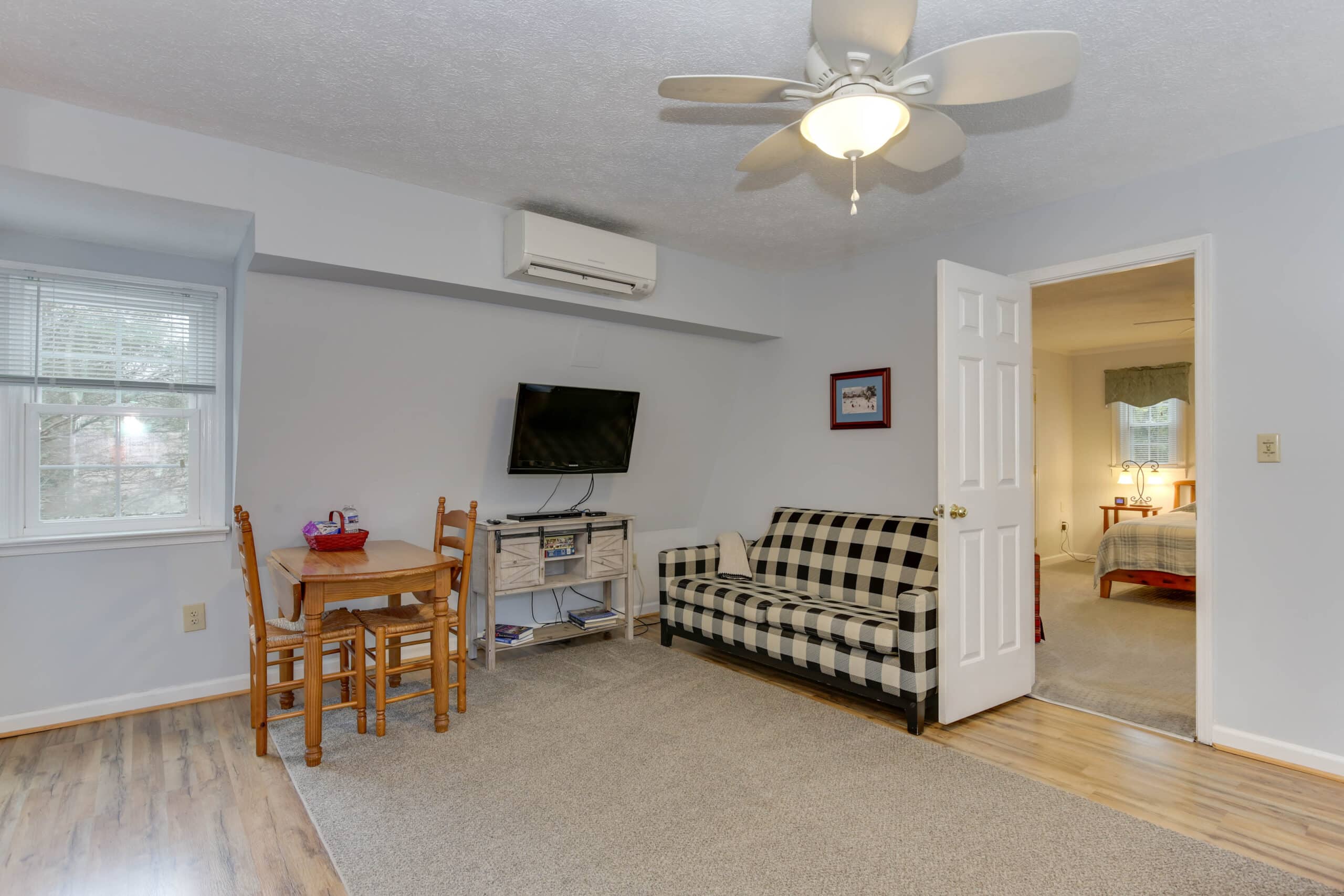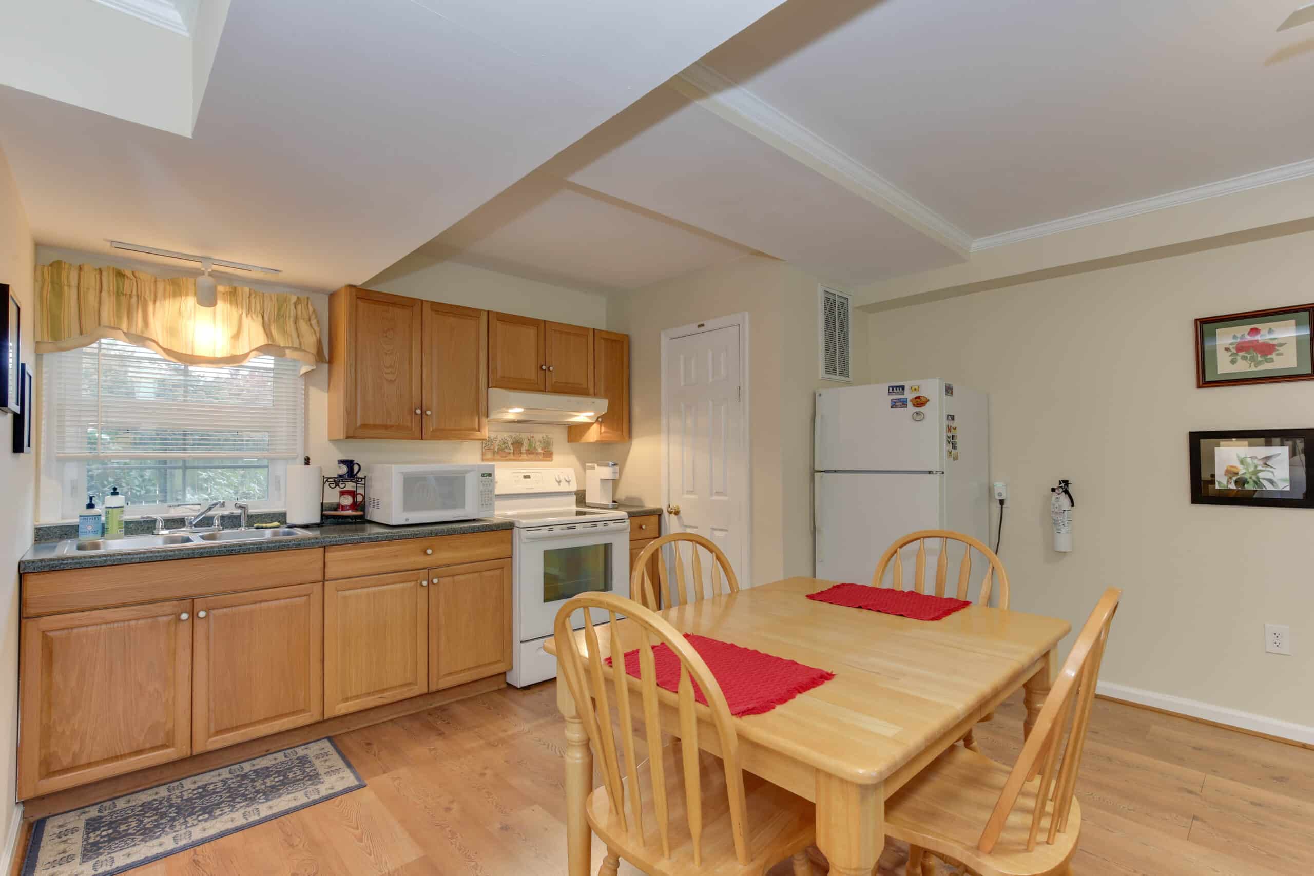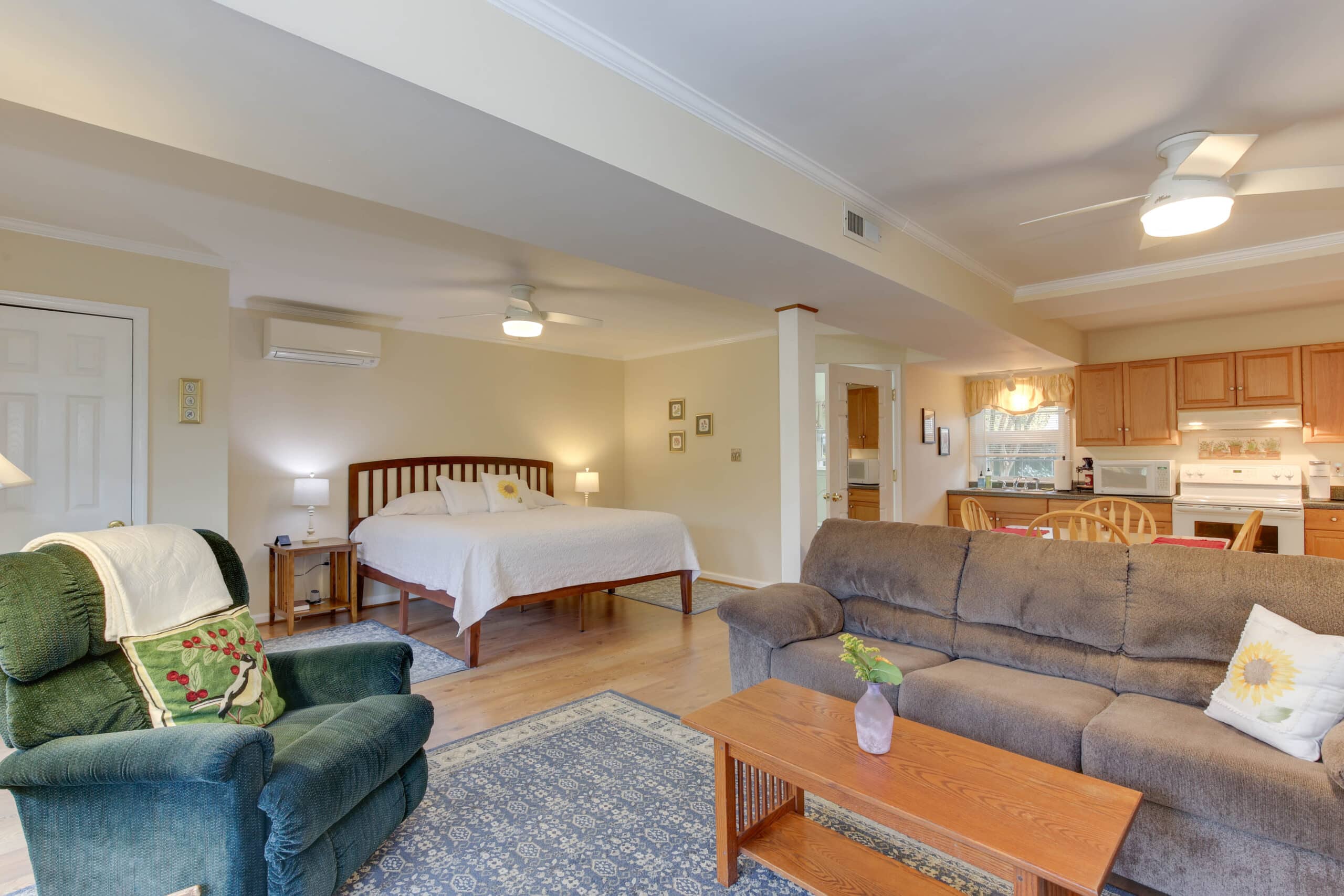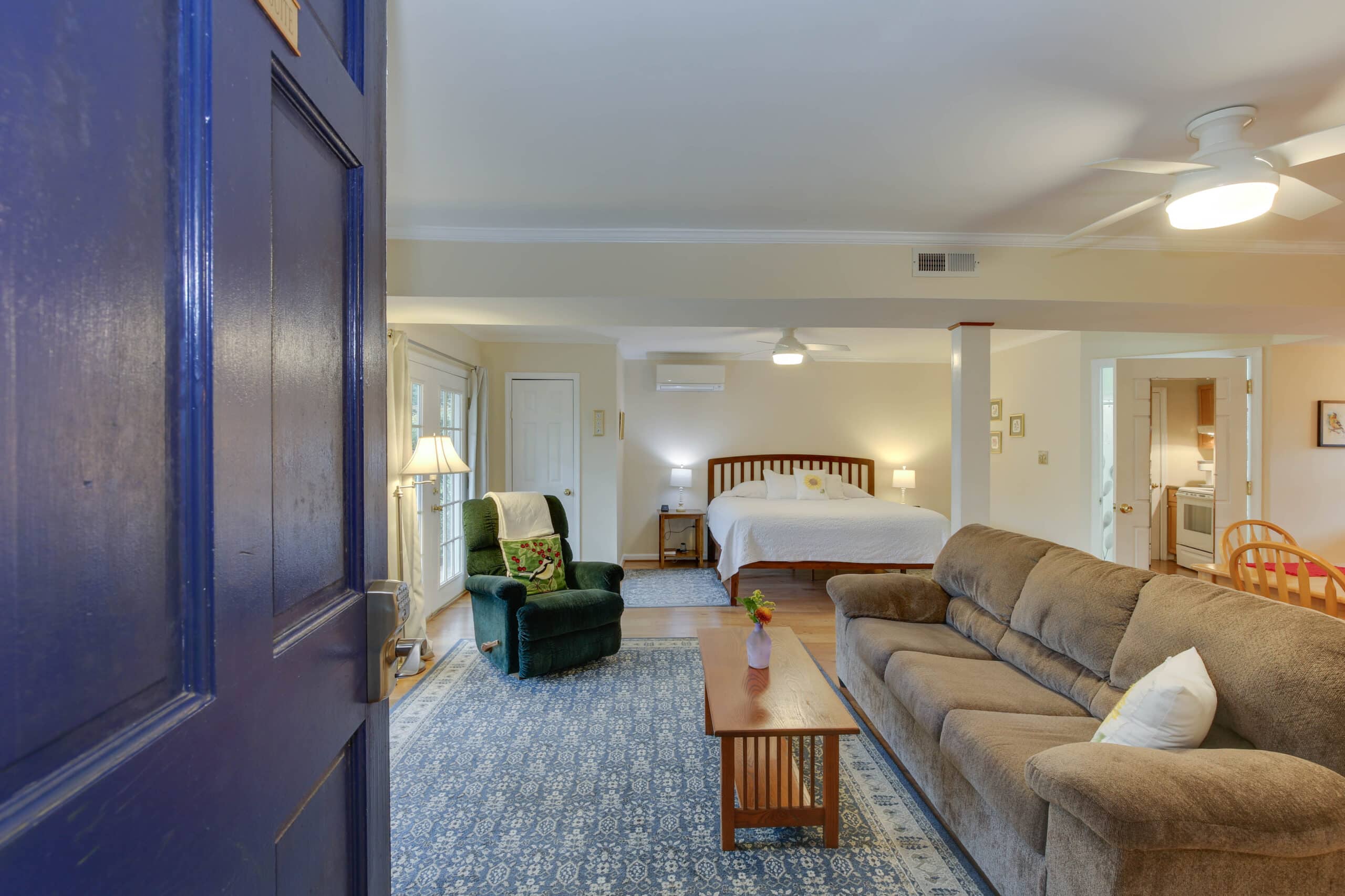 - Garden View Suite | 600 sq. ft. | King | Ground Floor | Full Kitchen | Private Exterior Entry — Spacious living room, dining table, and full kitchen. Accessible-friendly ground-level unit.