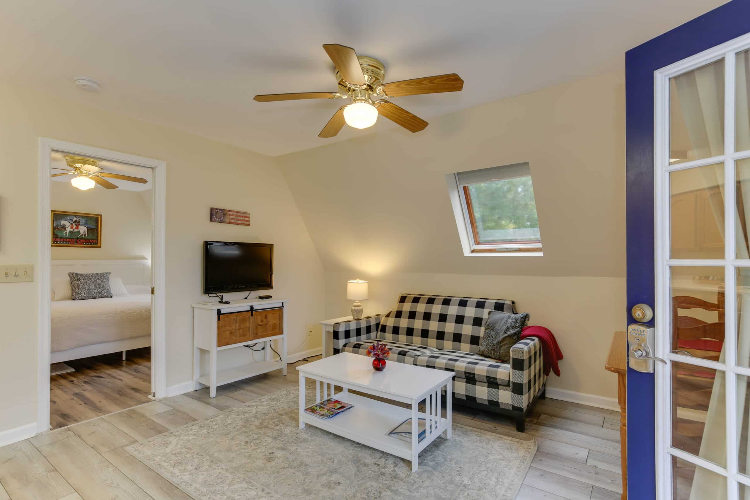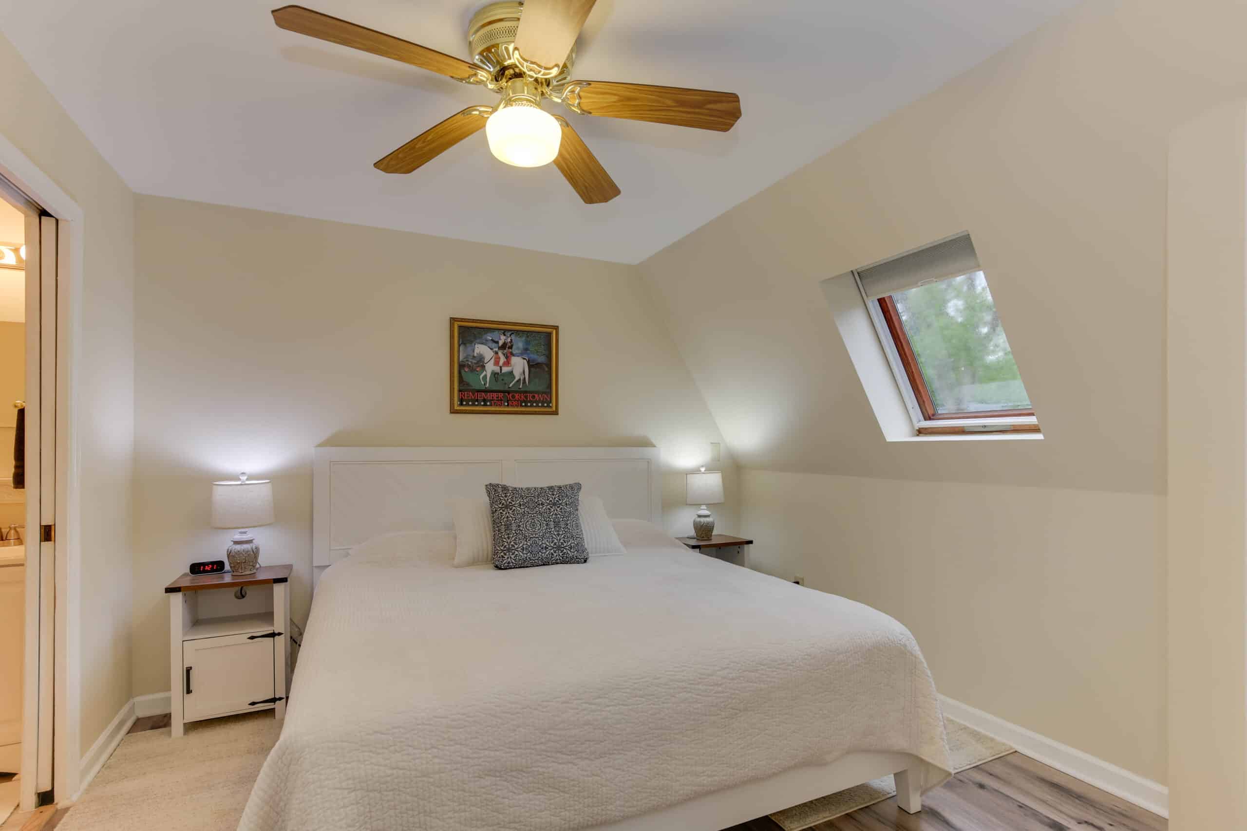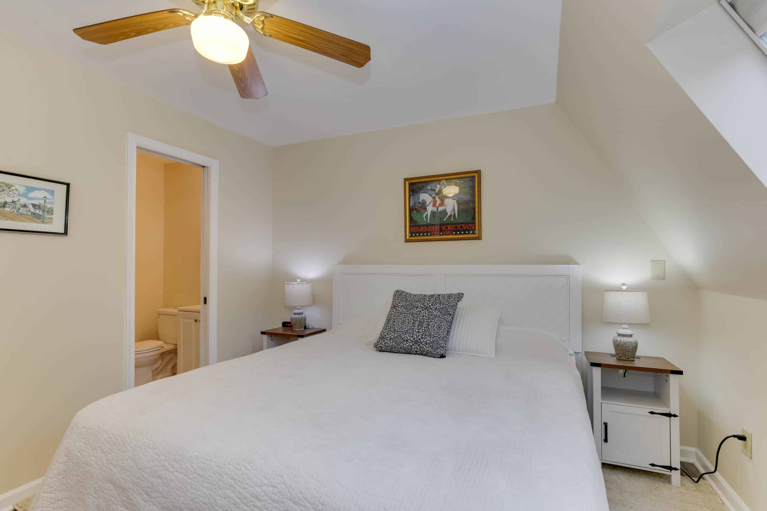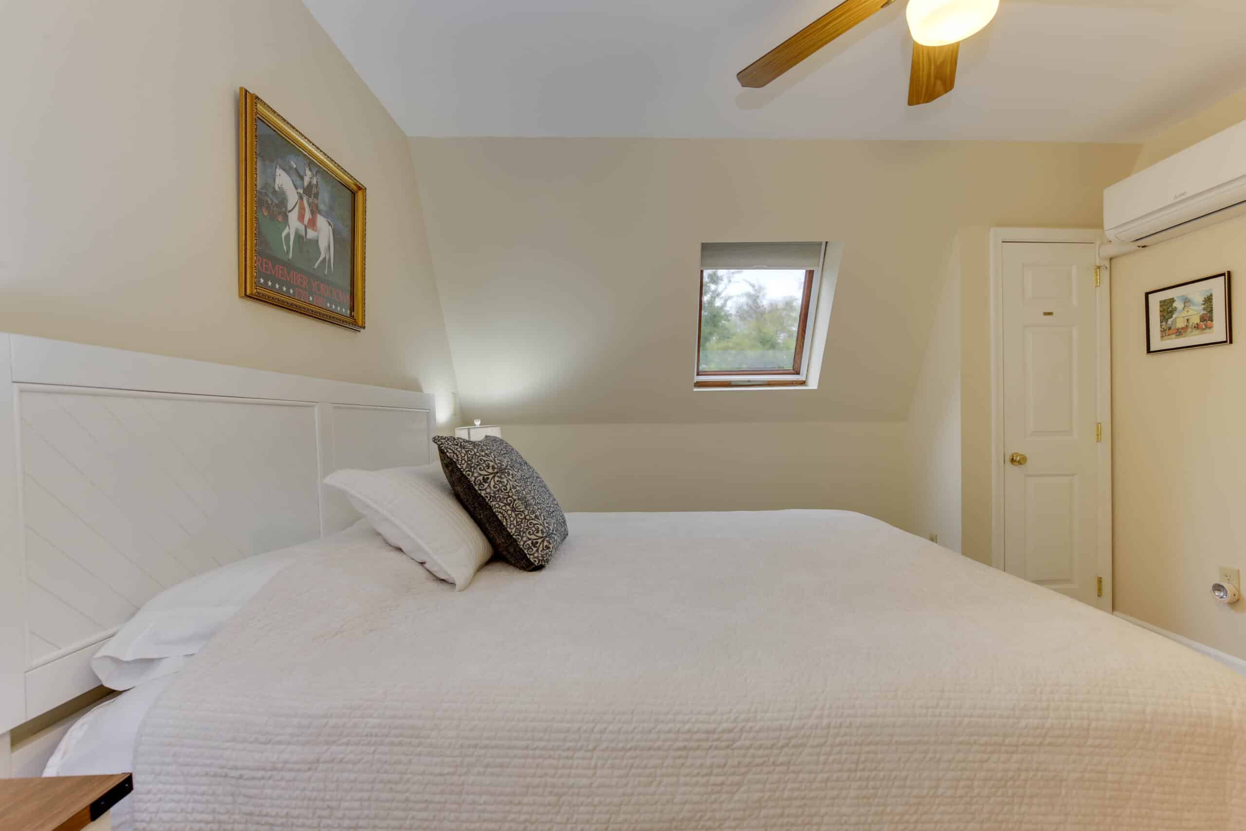 - Yorktown Suite | 400 sq. ft. | King | 2nd Floor | Full Kitchen | Private Exterior Entry — King suite with full kitchen and sloped ceiling with character window detail.