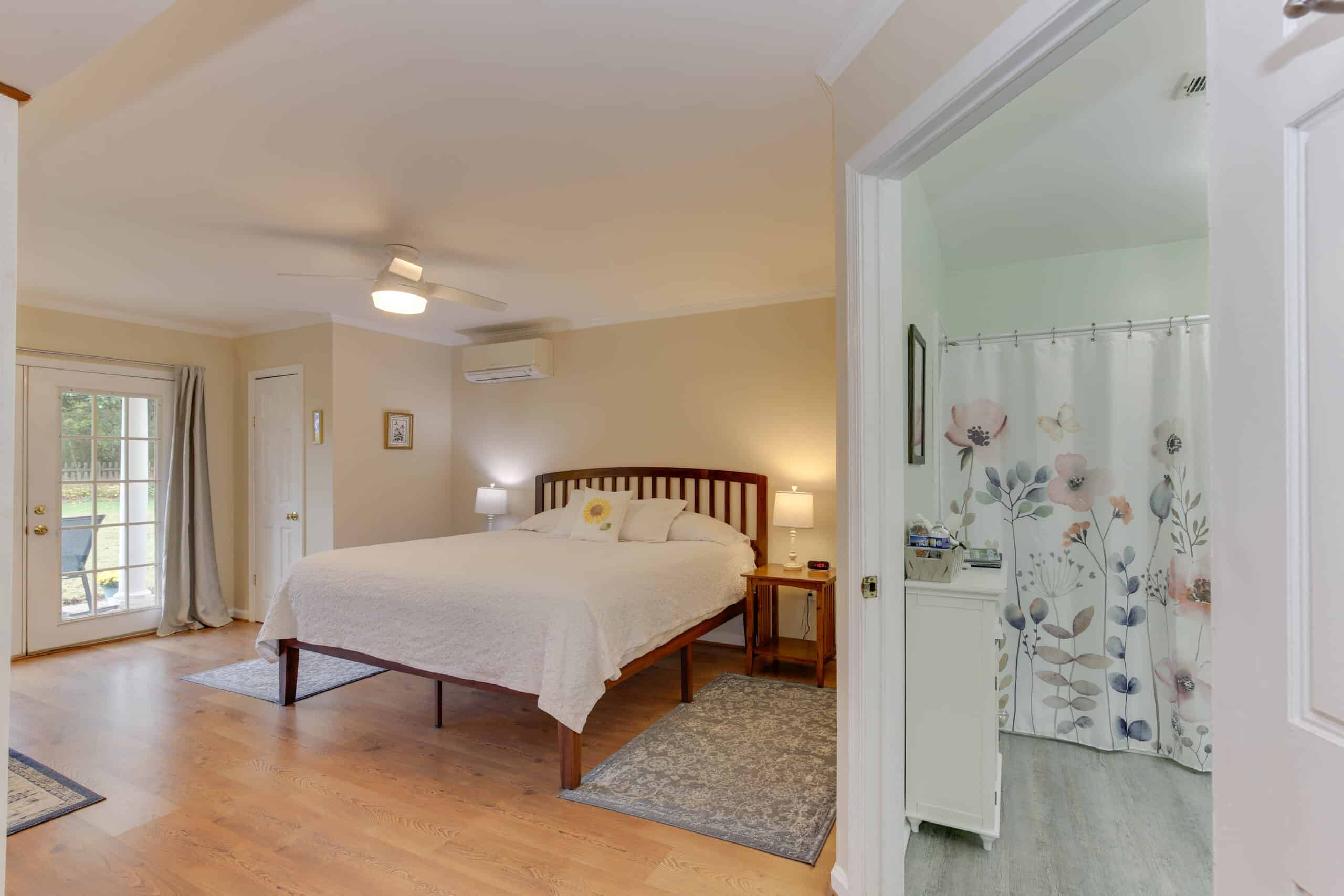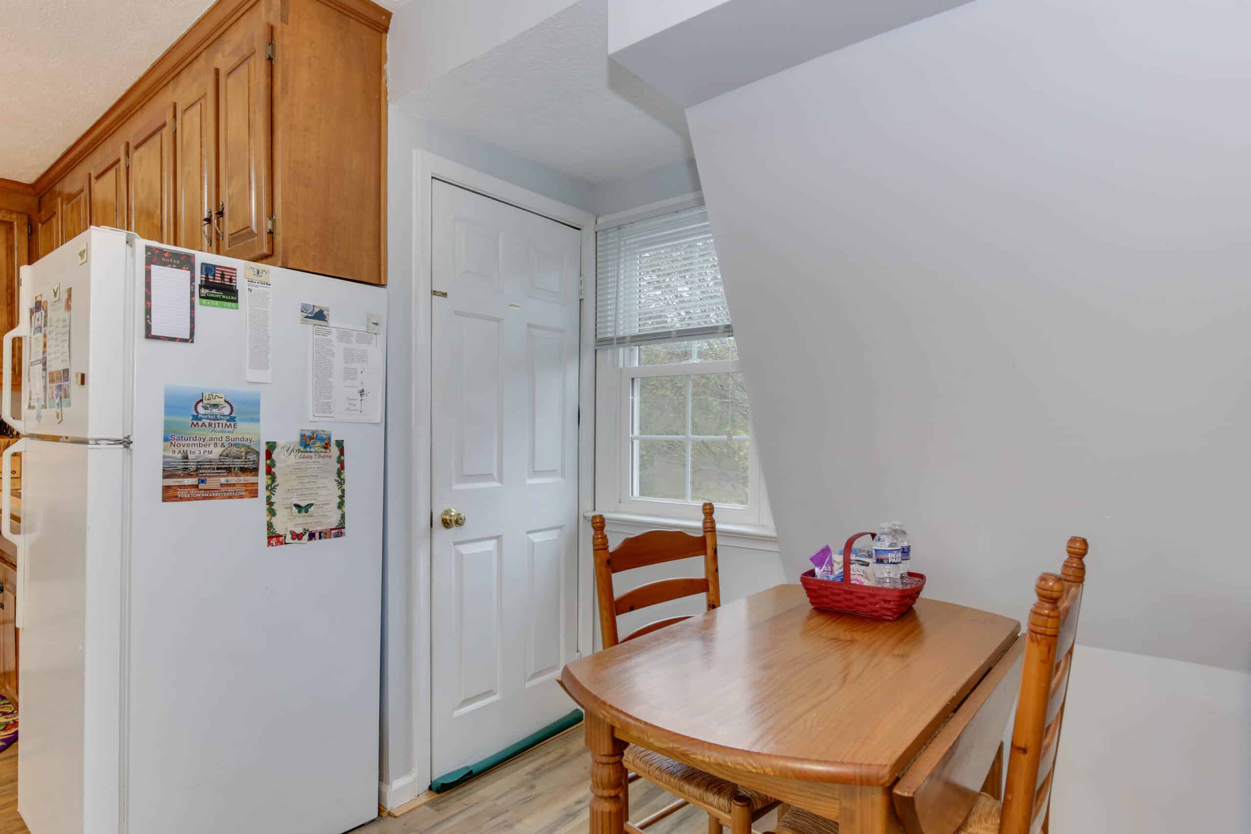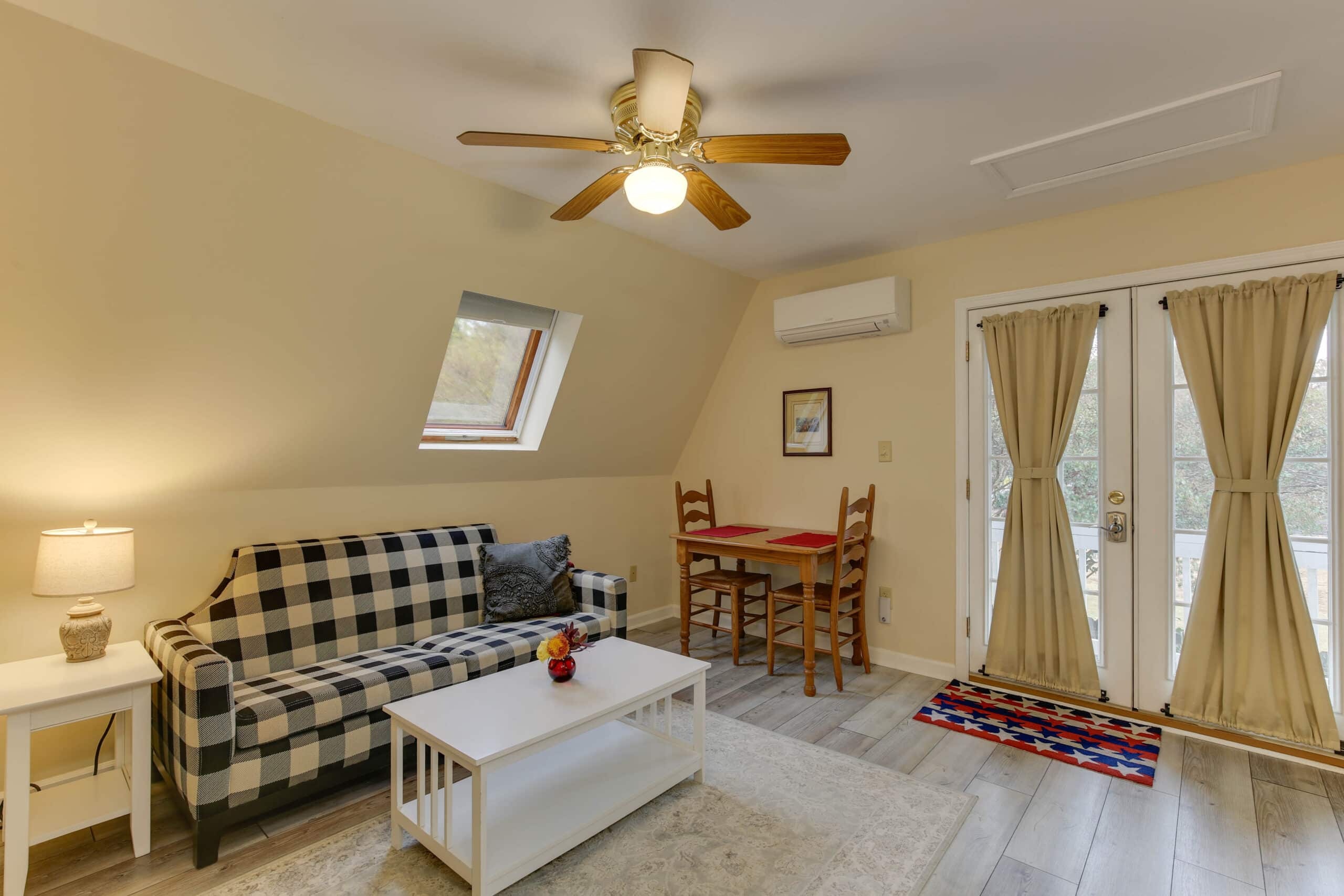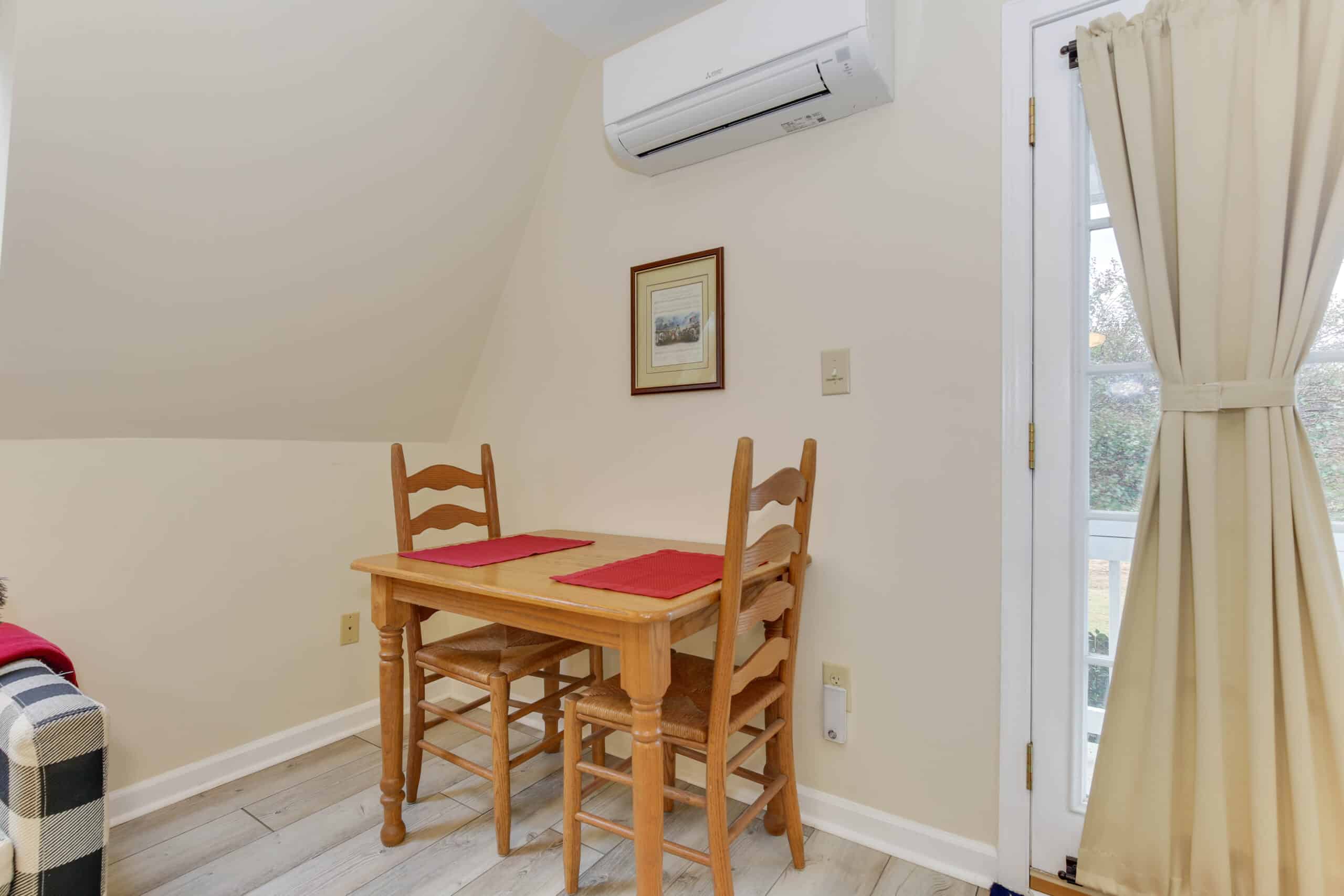 - Yorktown Suite | 400 sq. ft. | King | 2nd Floor | Full Kitchen | Private Exterior Entry — King suite with full kitchen and sloped ceiling with character window detail.
