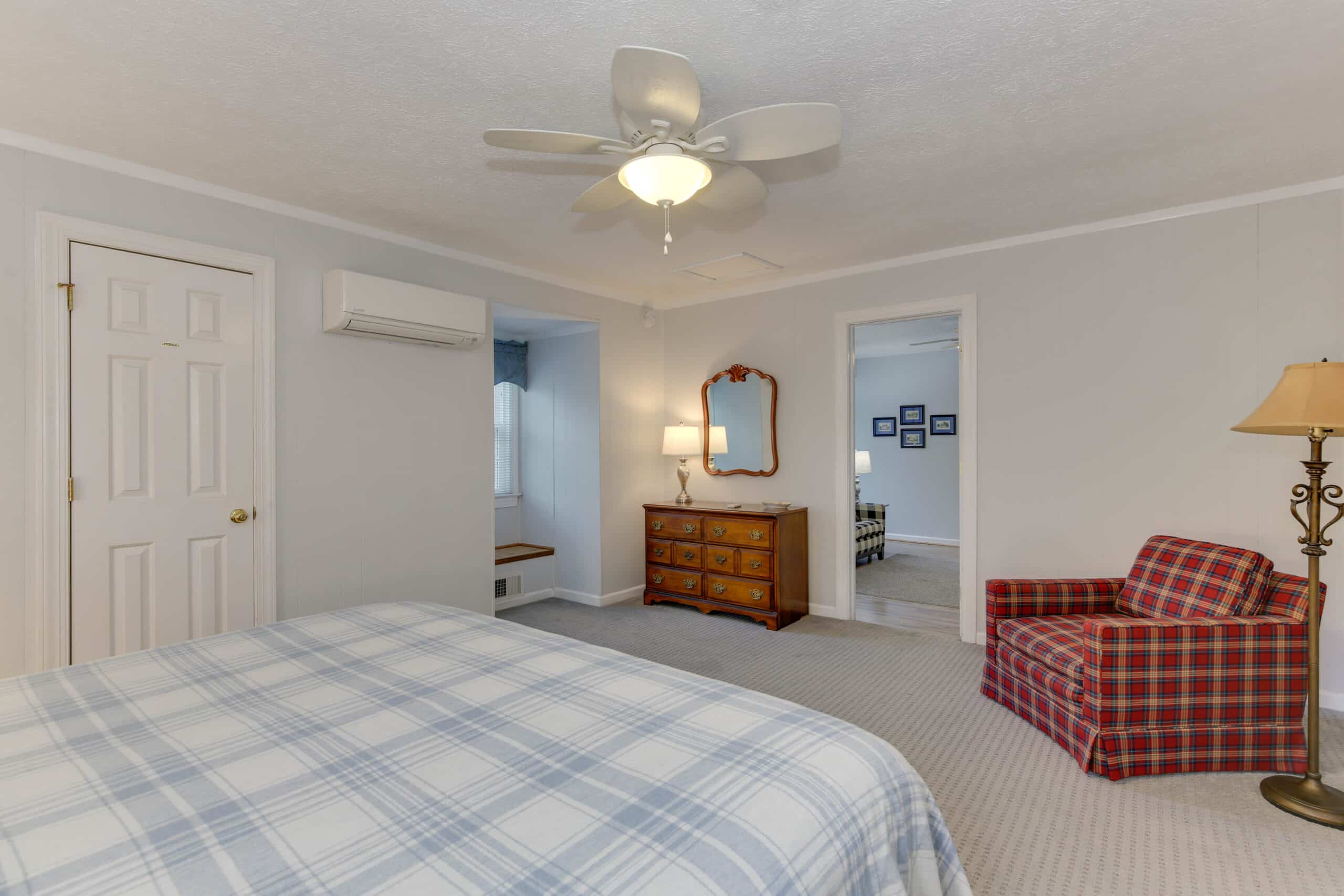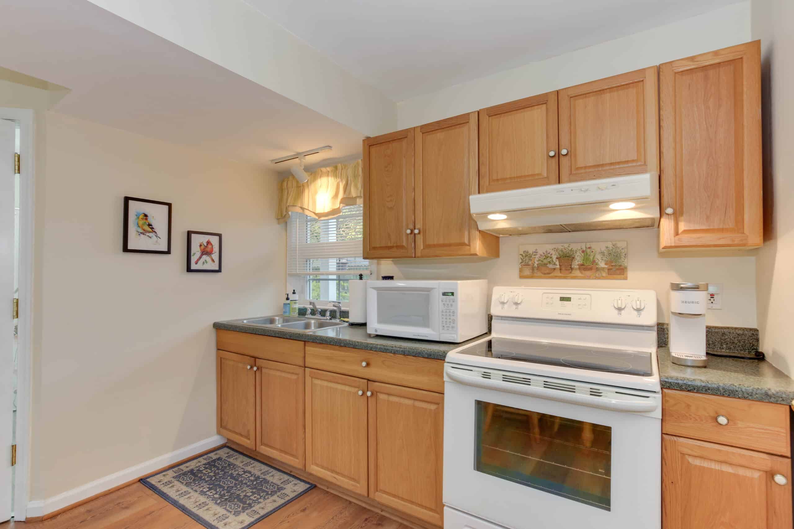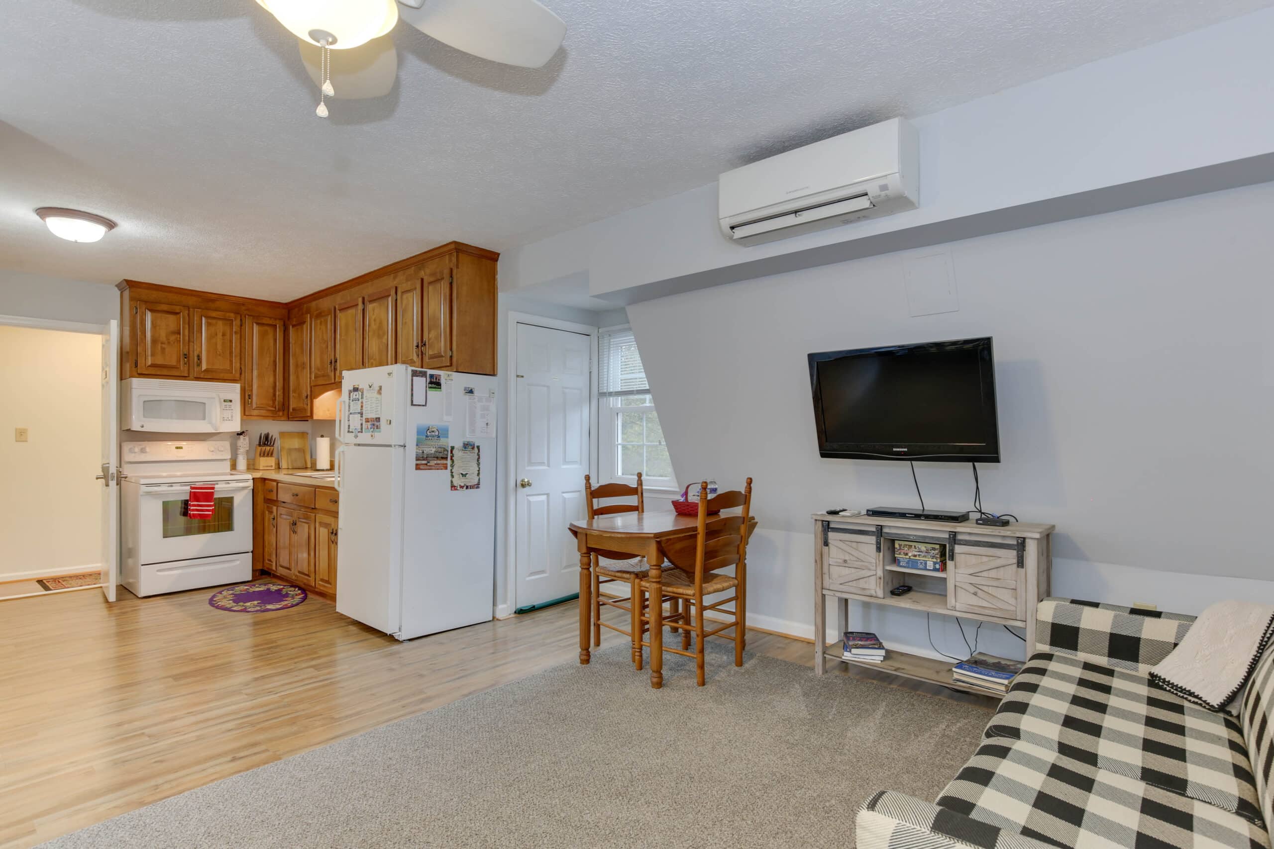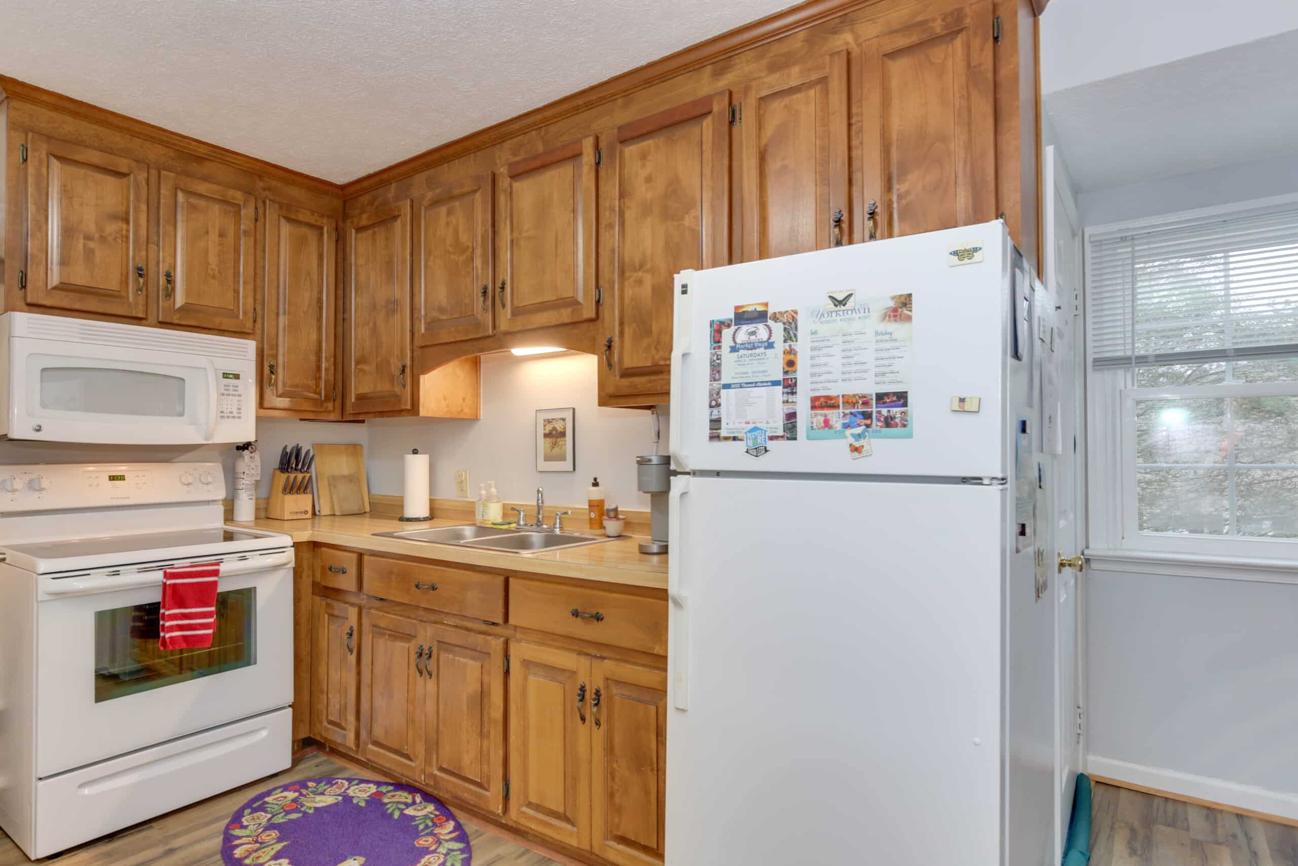 - Yorktown Suite | 400 sq. ft. | King | 2nd Floor | Full Kitchen | Private Exterior Entry — King suite with full kitchen and sloped ceiling with character window detail.