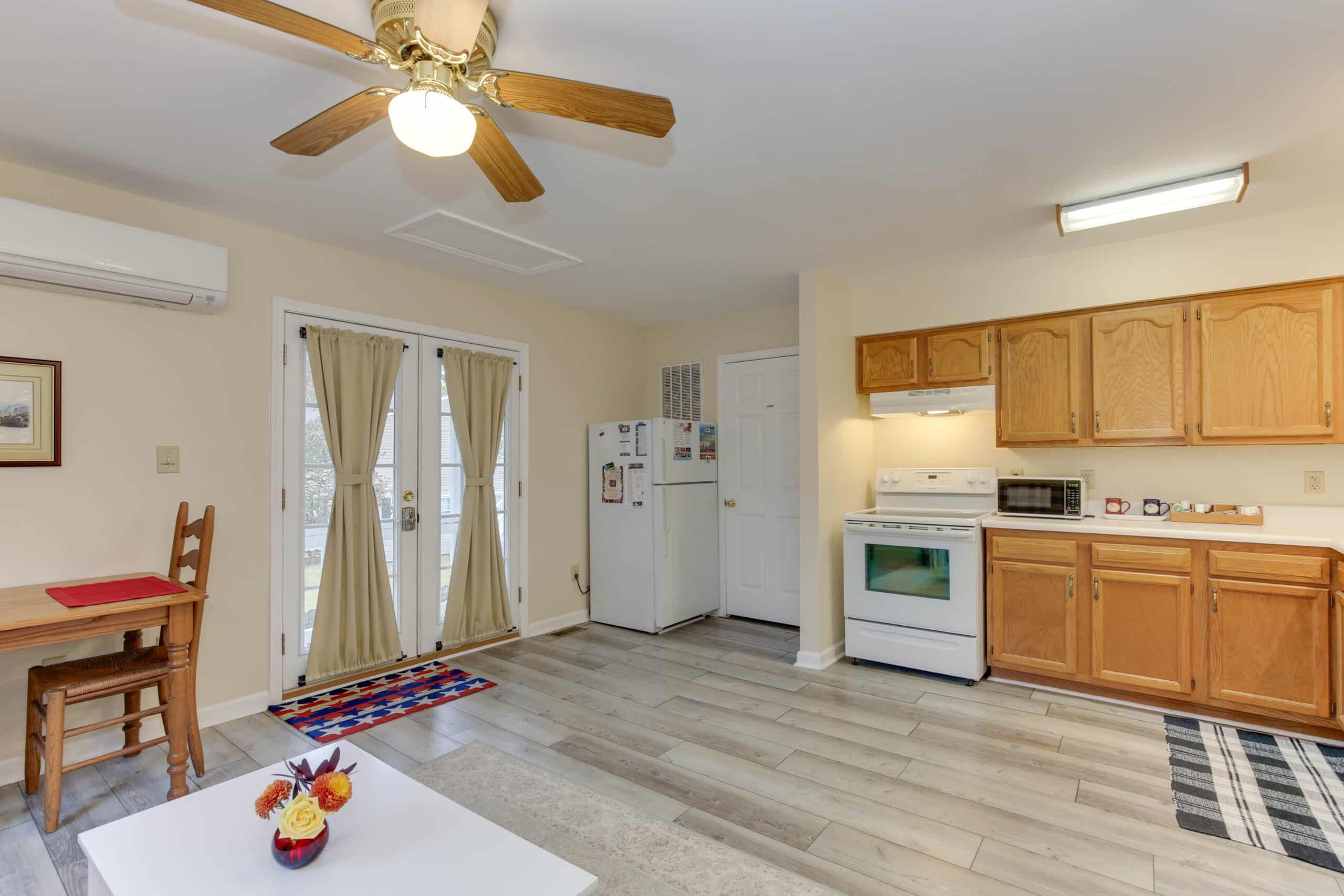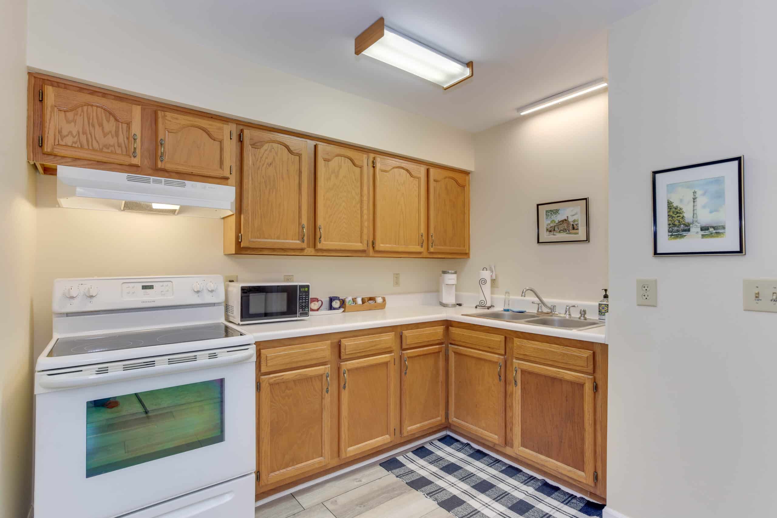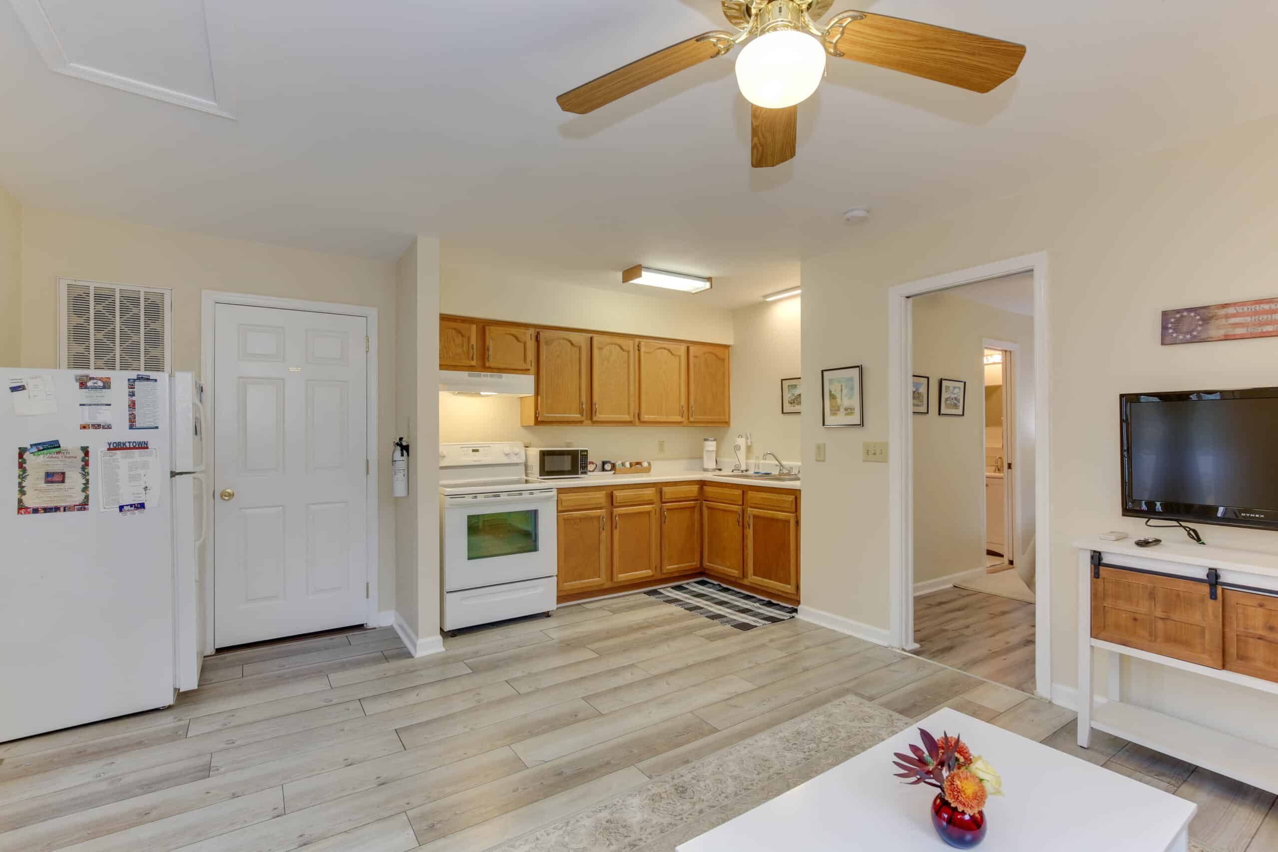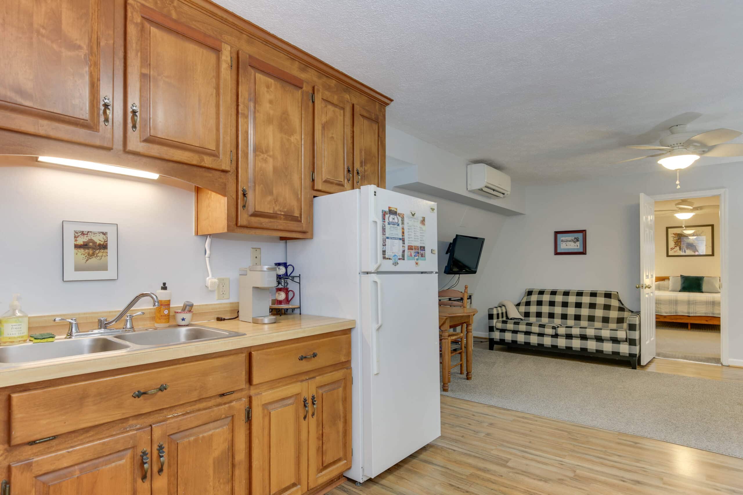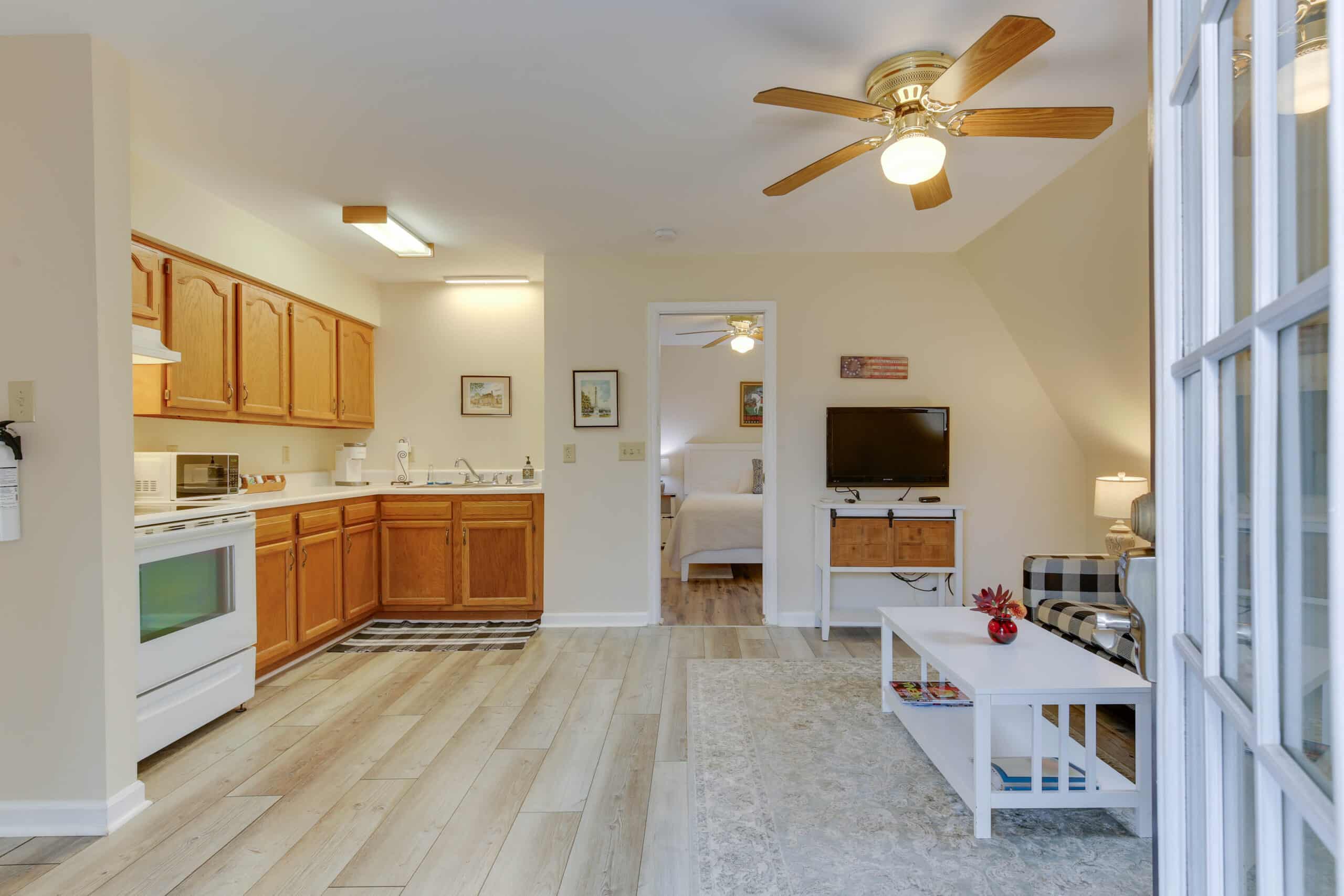 - Patriot Suite | 500 sq. ft. | King | 2nd Floor | Full Kitchen | Private Exterior Entry — Second-floor retreat with full kitchen, living area, and ironing board.