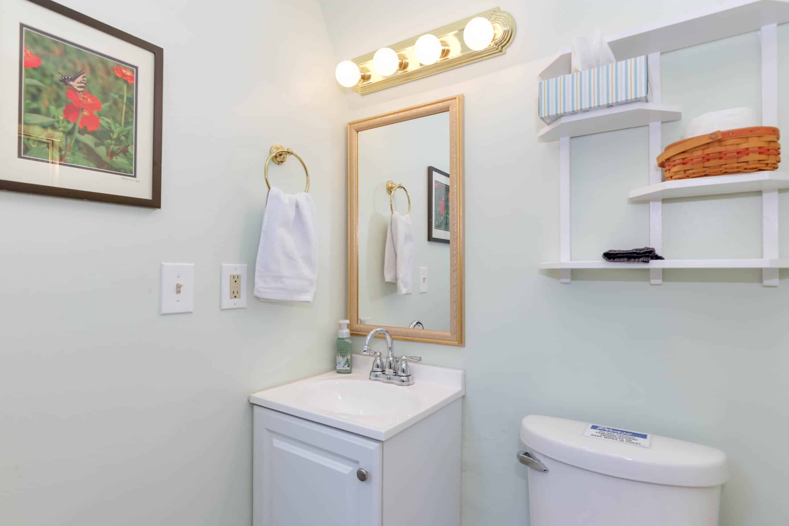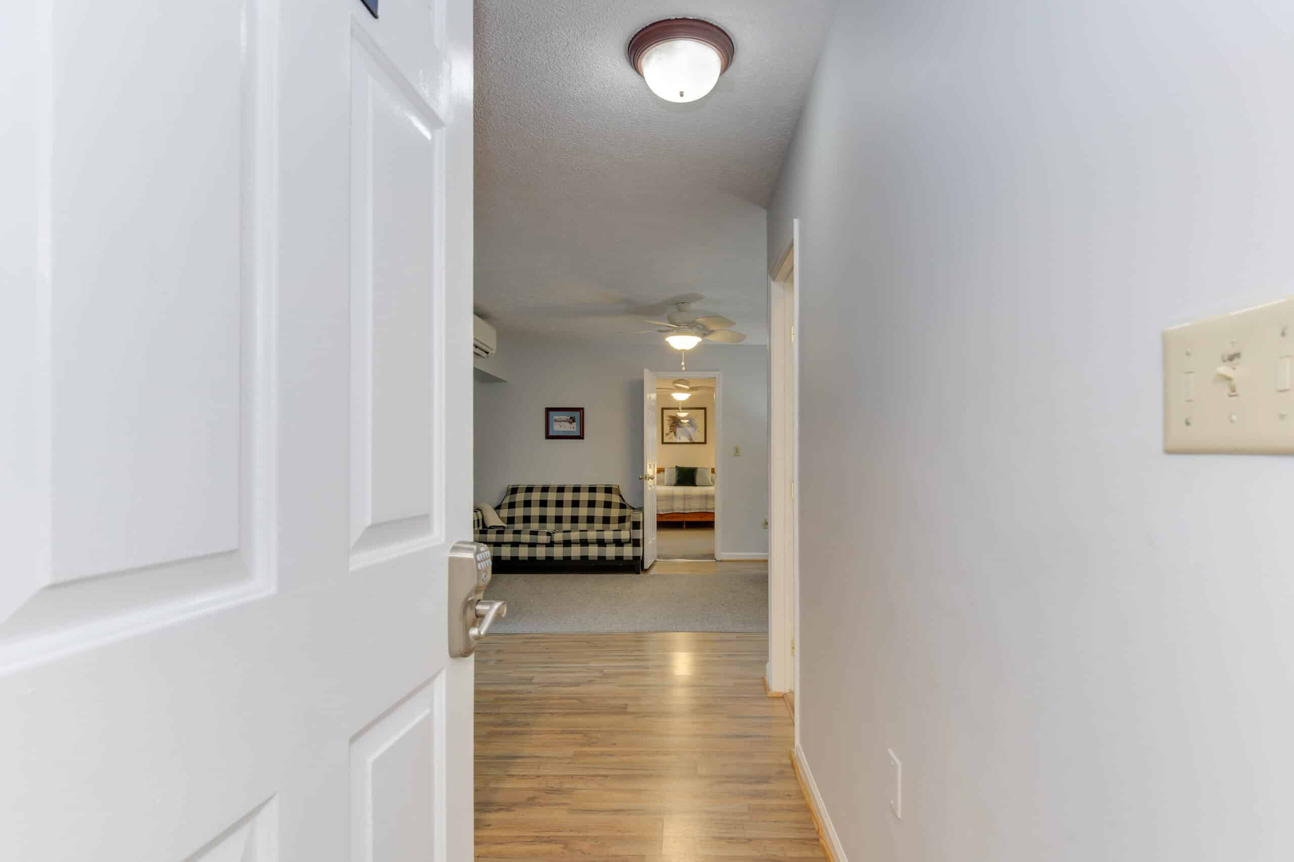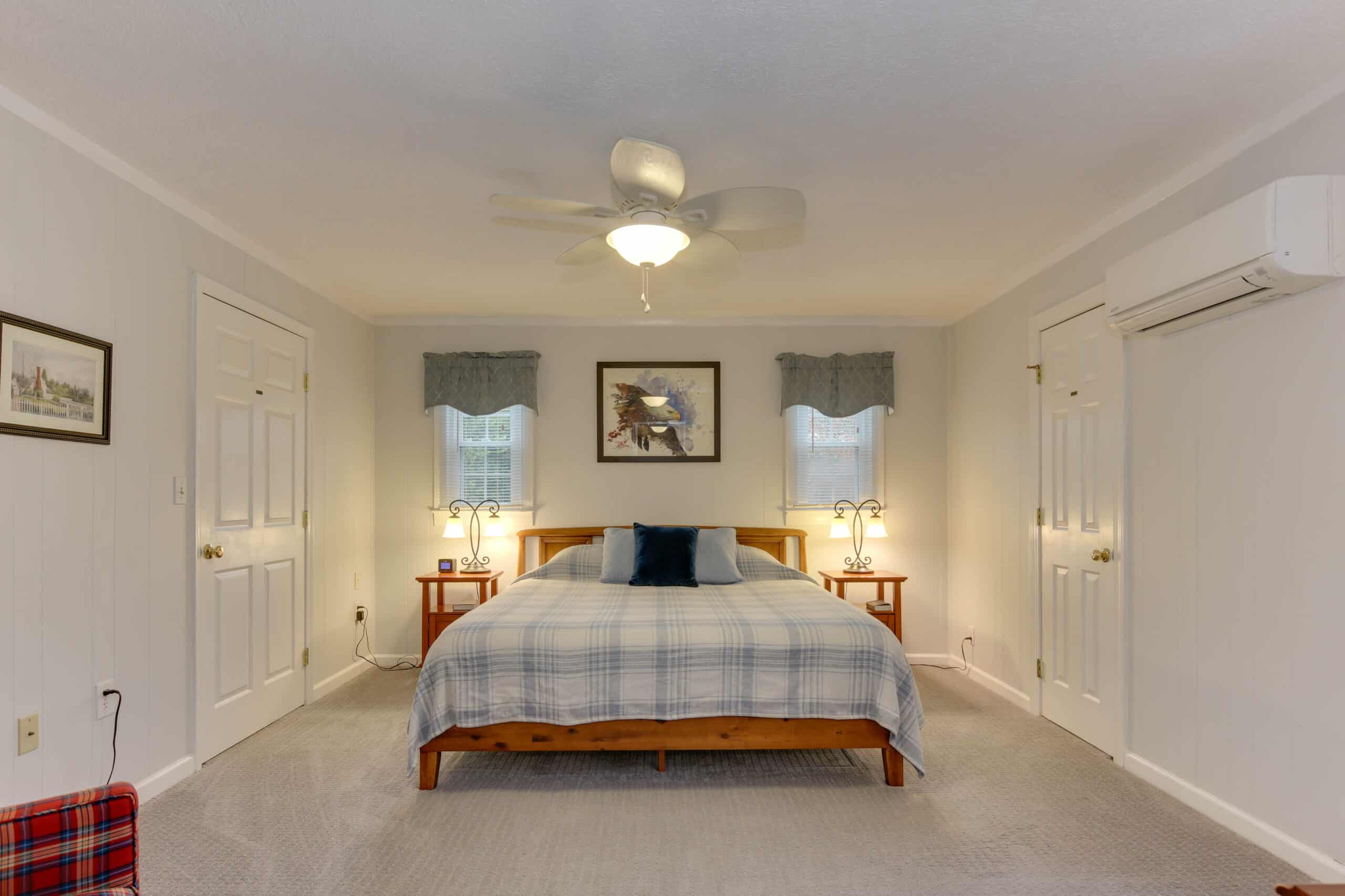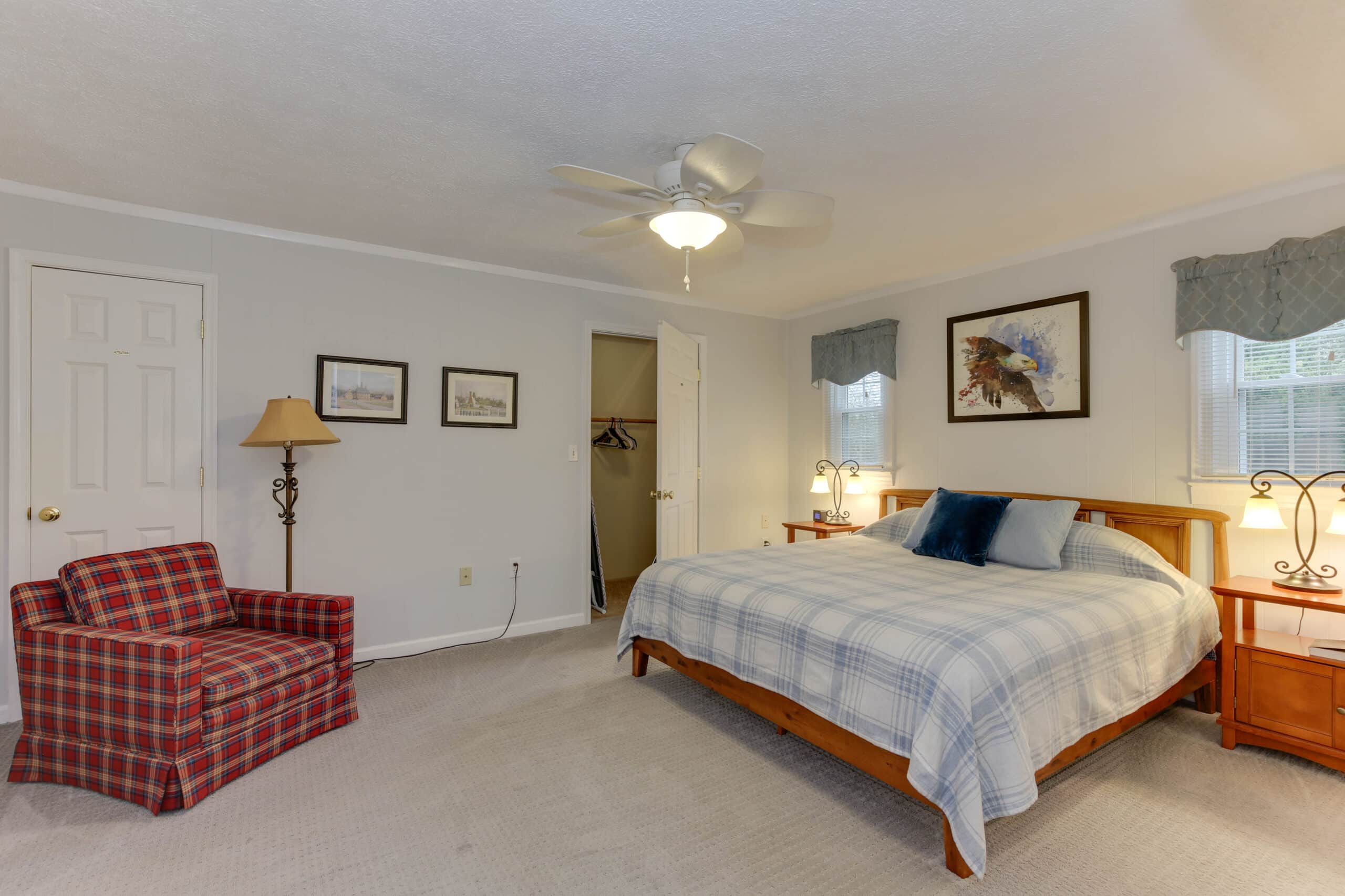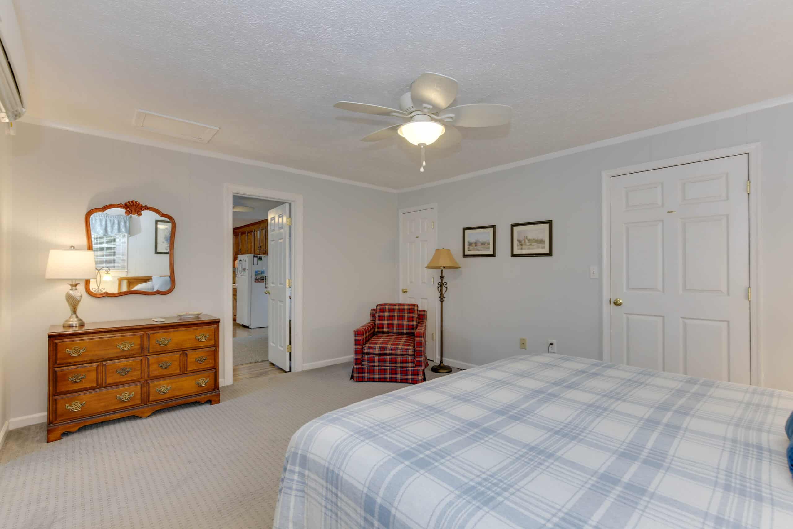 - Patriot Suite | 500 sq. ft. | King | 2nd Floor | Full Kitchen | Private Exterior Entry — Second-floor retreat with full kitchen, living area, and ironing board.