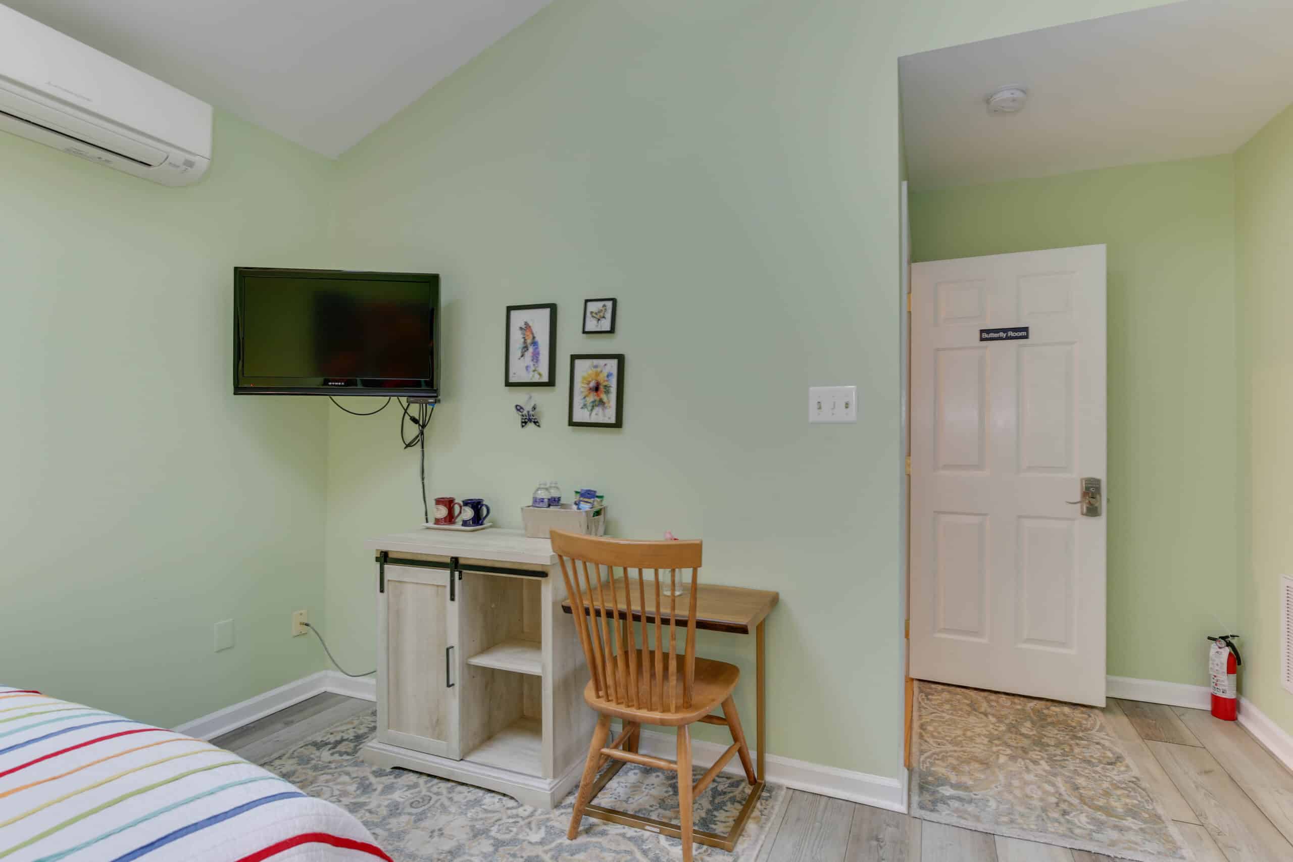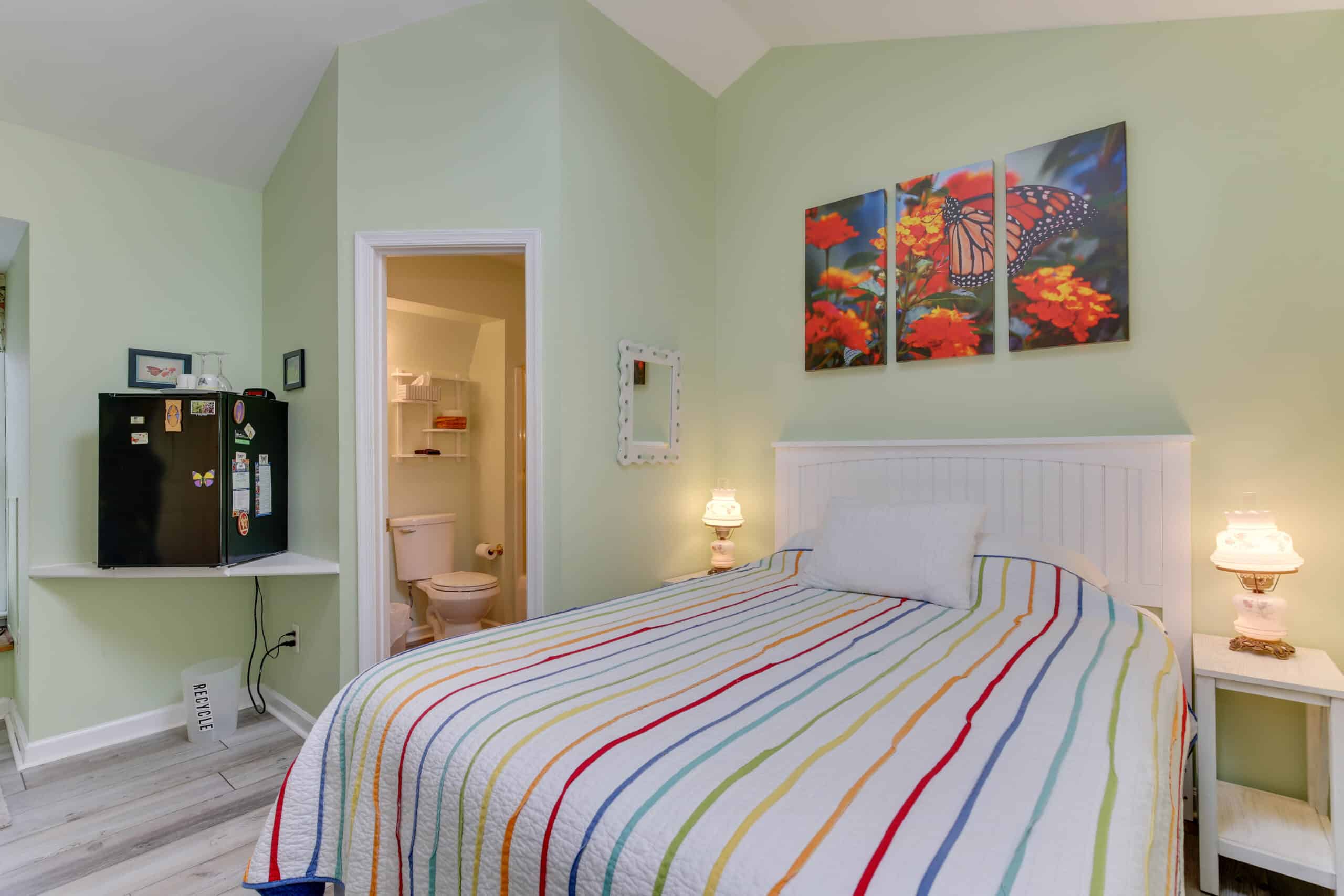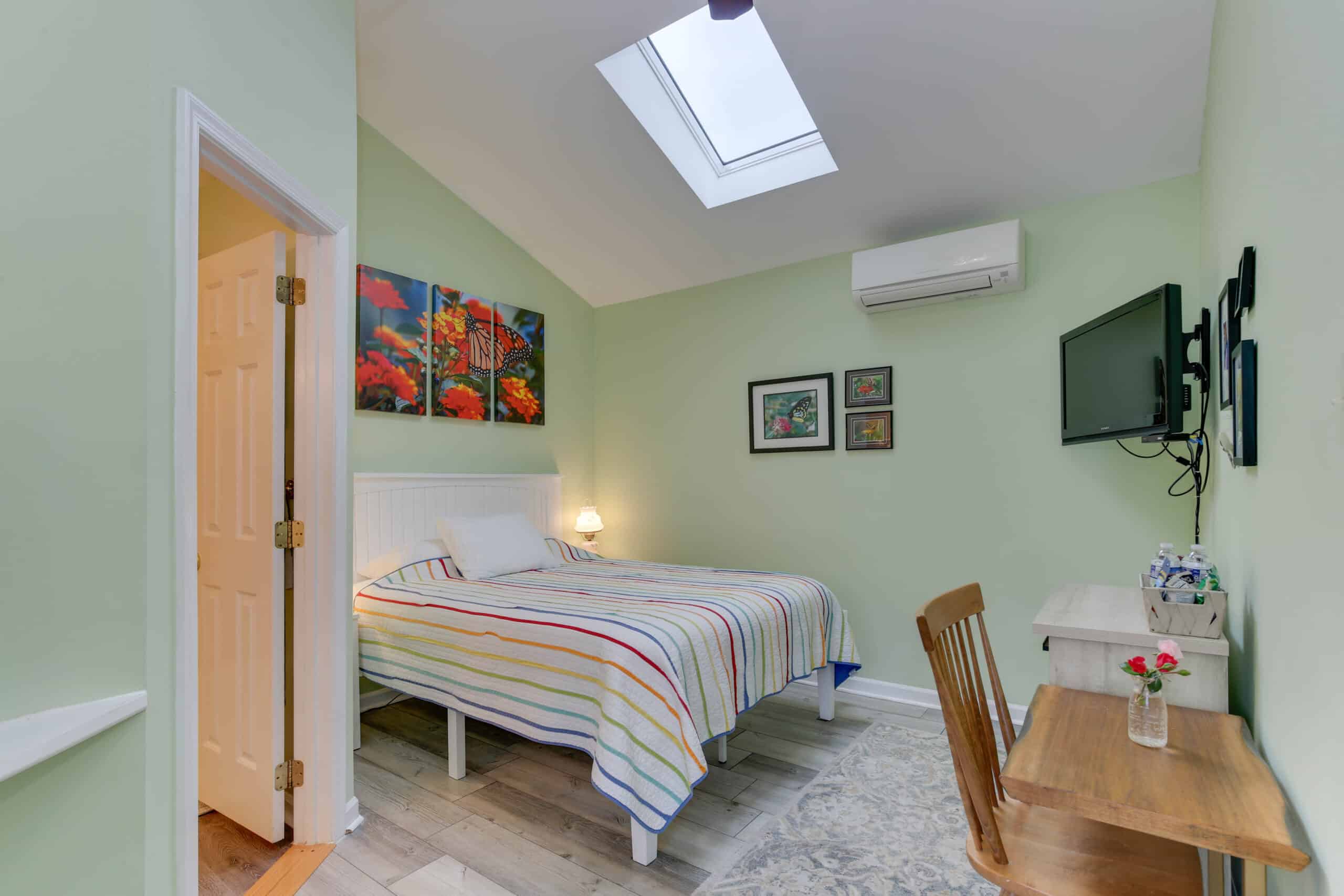 - Butterfly Room | 200 sq. ft. | Queen | 2nd Floor | Mini-Fridge | Private Exterior Entry — Cozy queen room with skylight, raised ceiling, laptop desk, and Keurig.