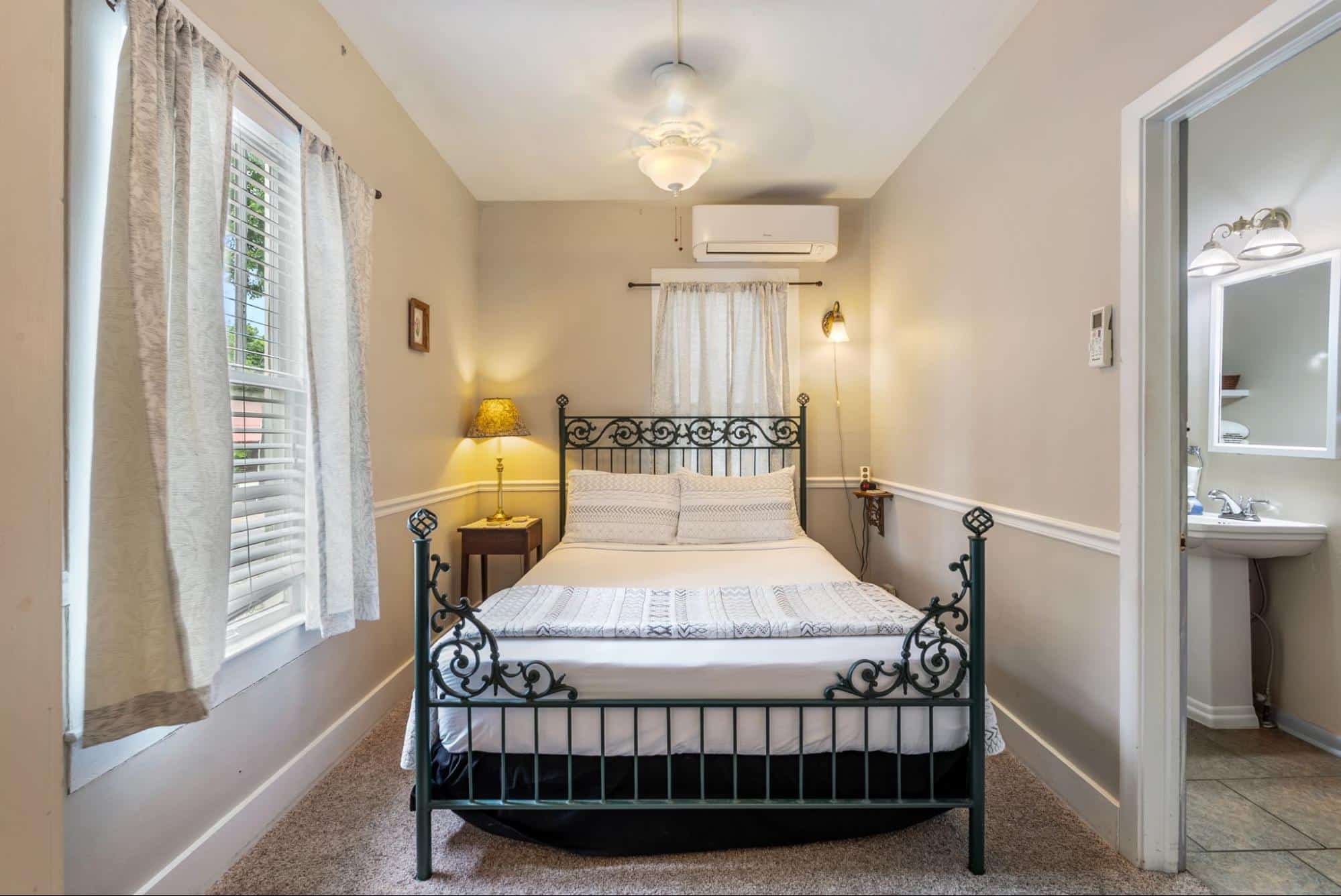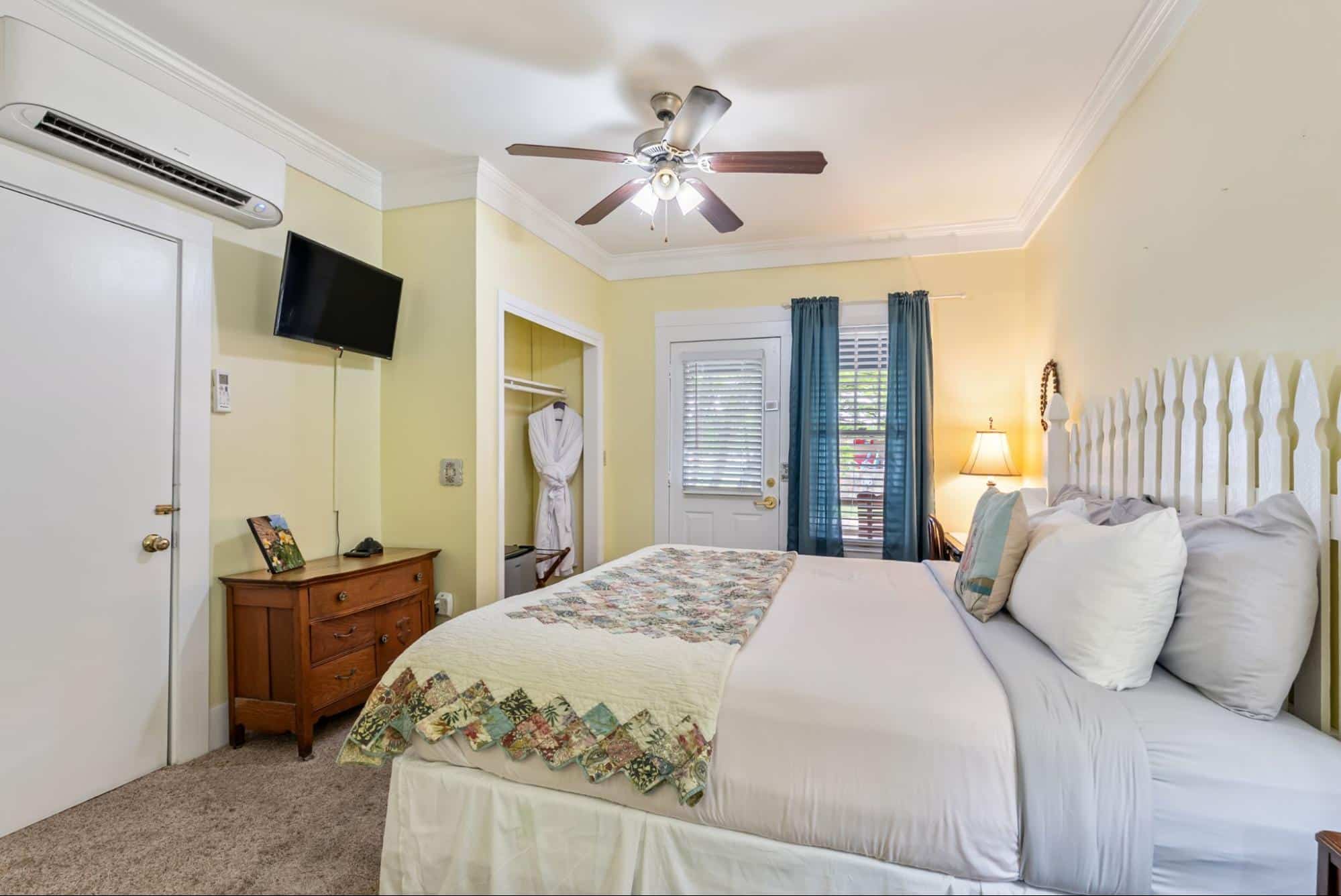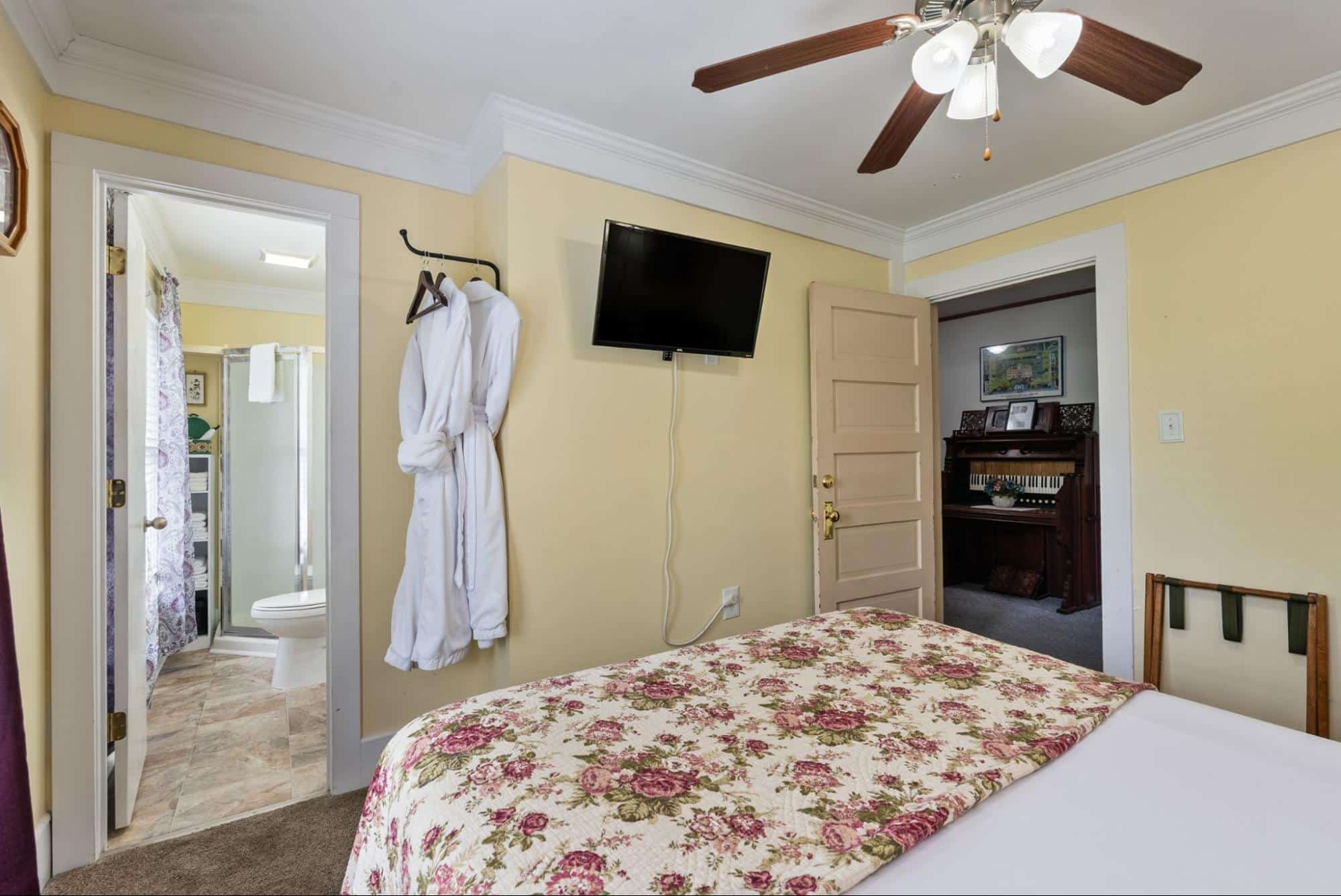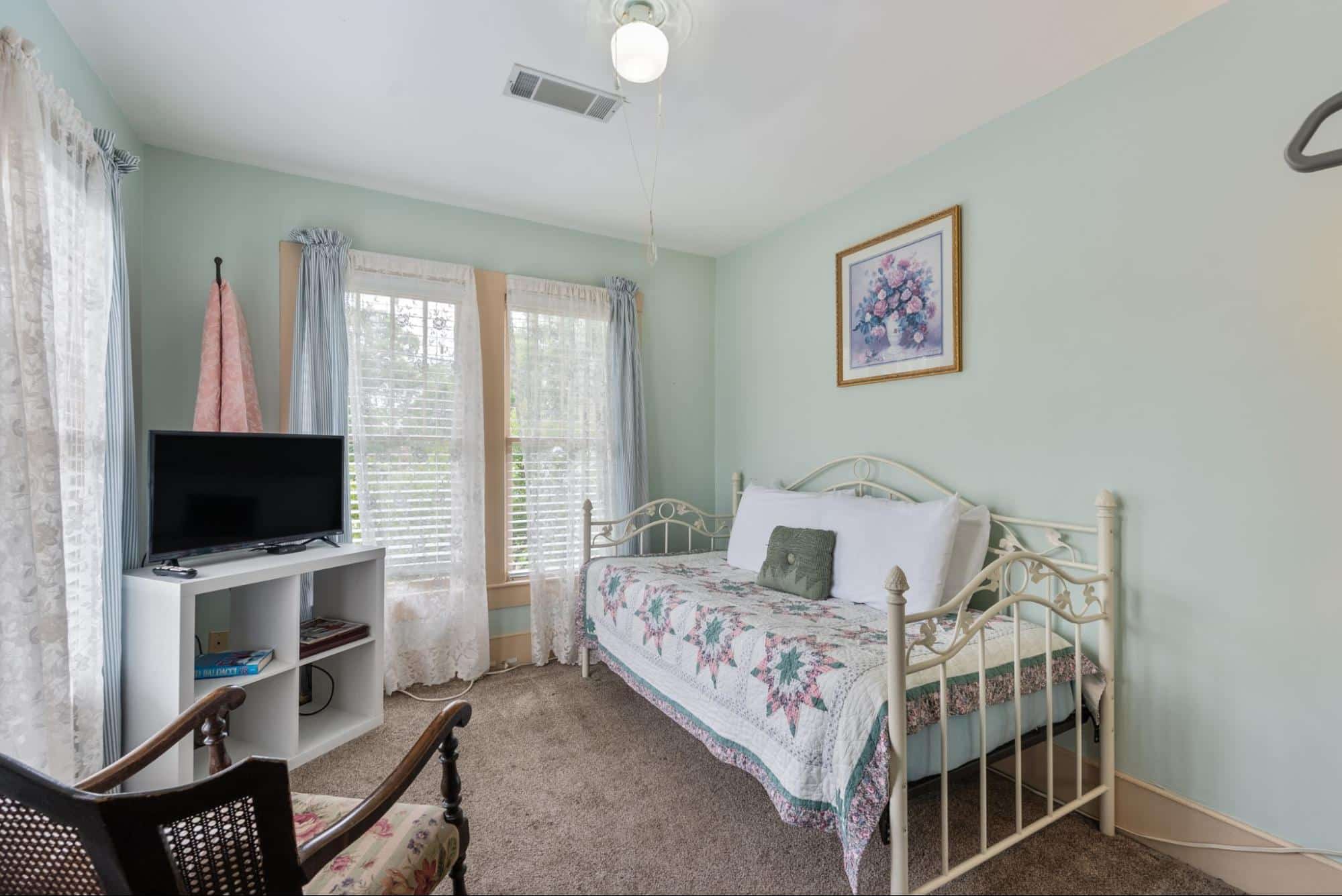 Common areas include the guest favorite large covered front porch with ample guest seating – the perfect location to pull up a comfortable rocking chair and listen to music being played across the street. The large dining room hosts the Inn’s guests for the wonderful fresh breakfast and the parlor provides guests with an extra sitting area and includes board games and even musical instruments to test your talents. Guest often return to the porch in between daily activities to recharge with a cup of coffee, a cold drink, or a freshly baked treat.