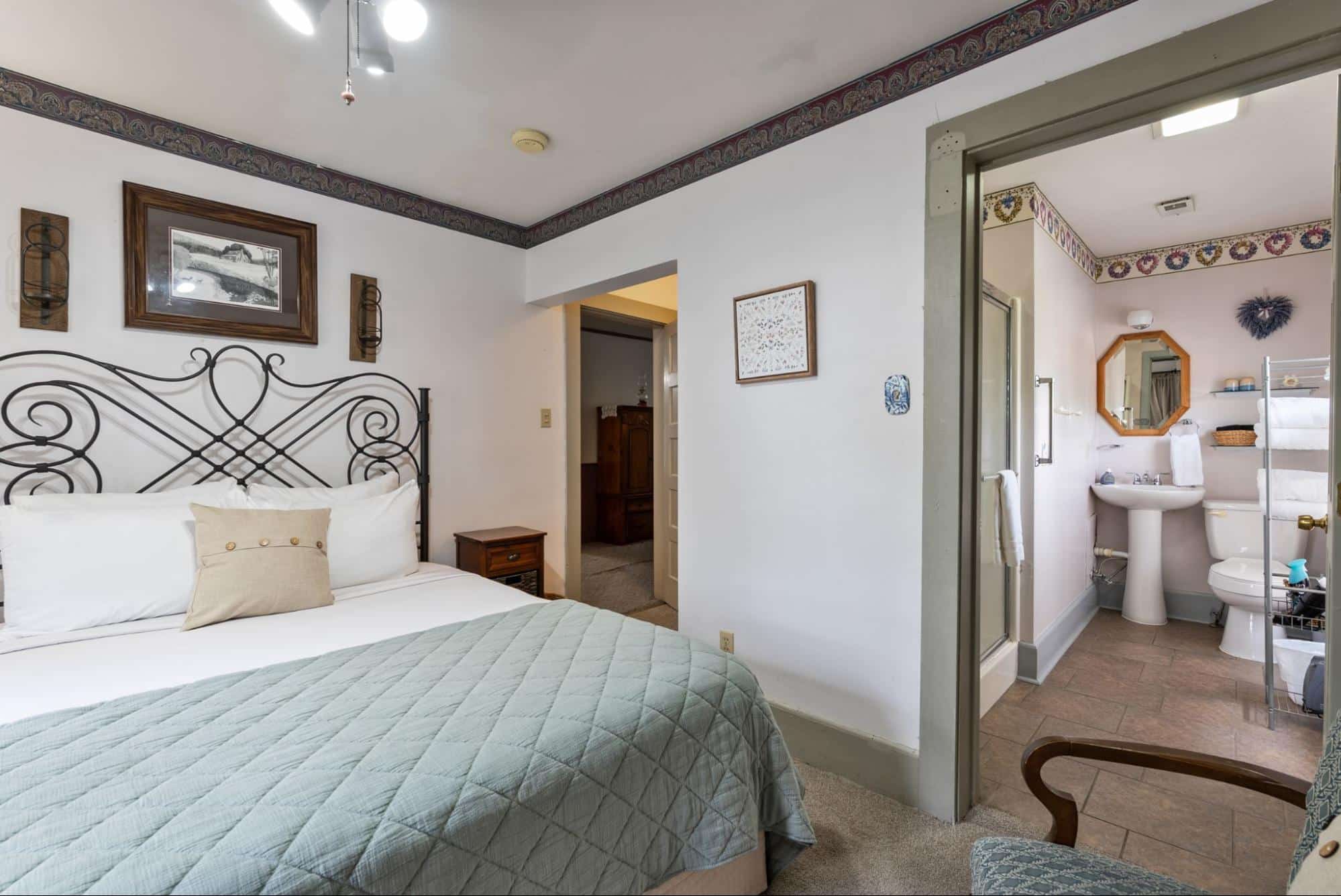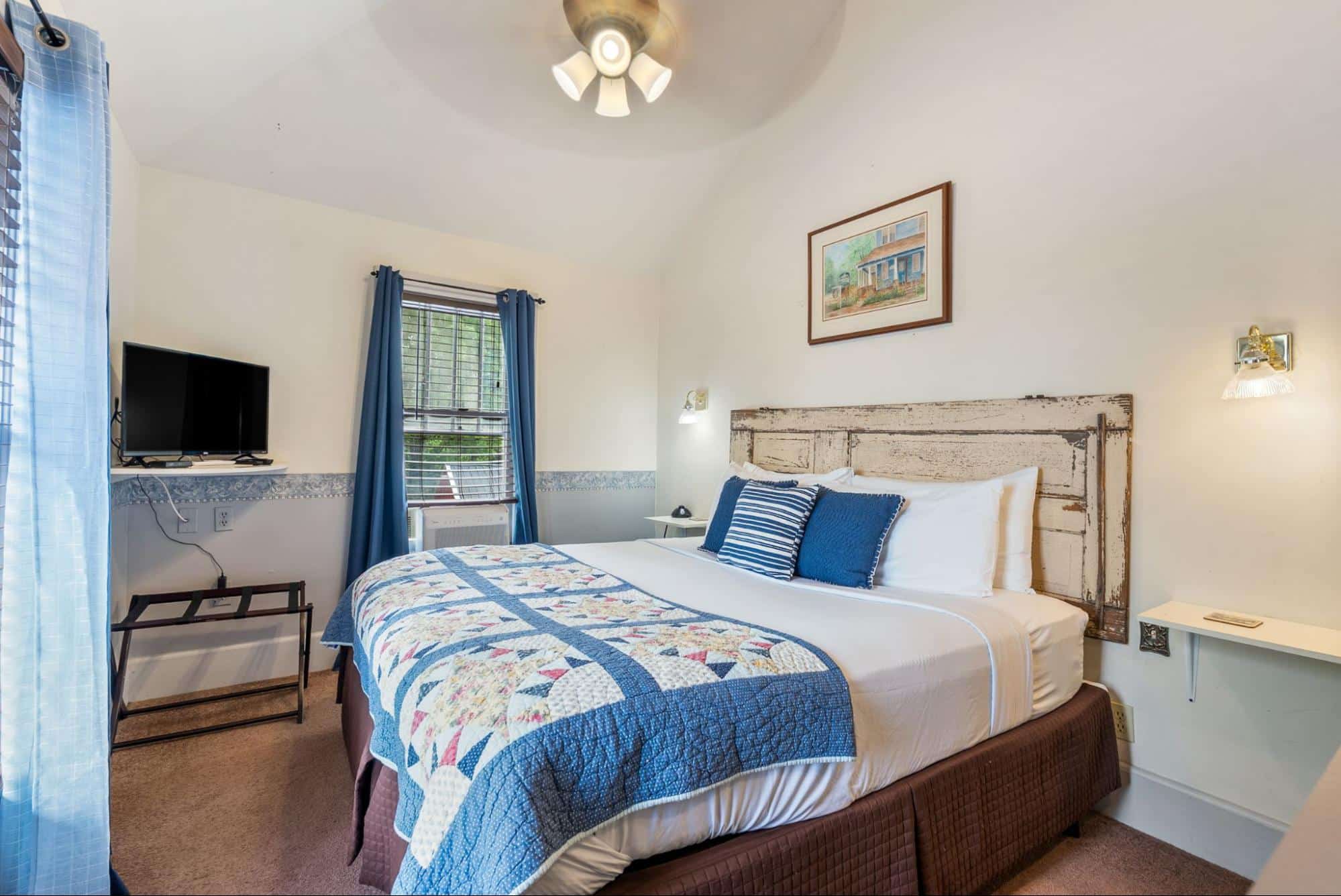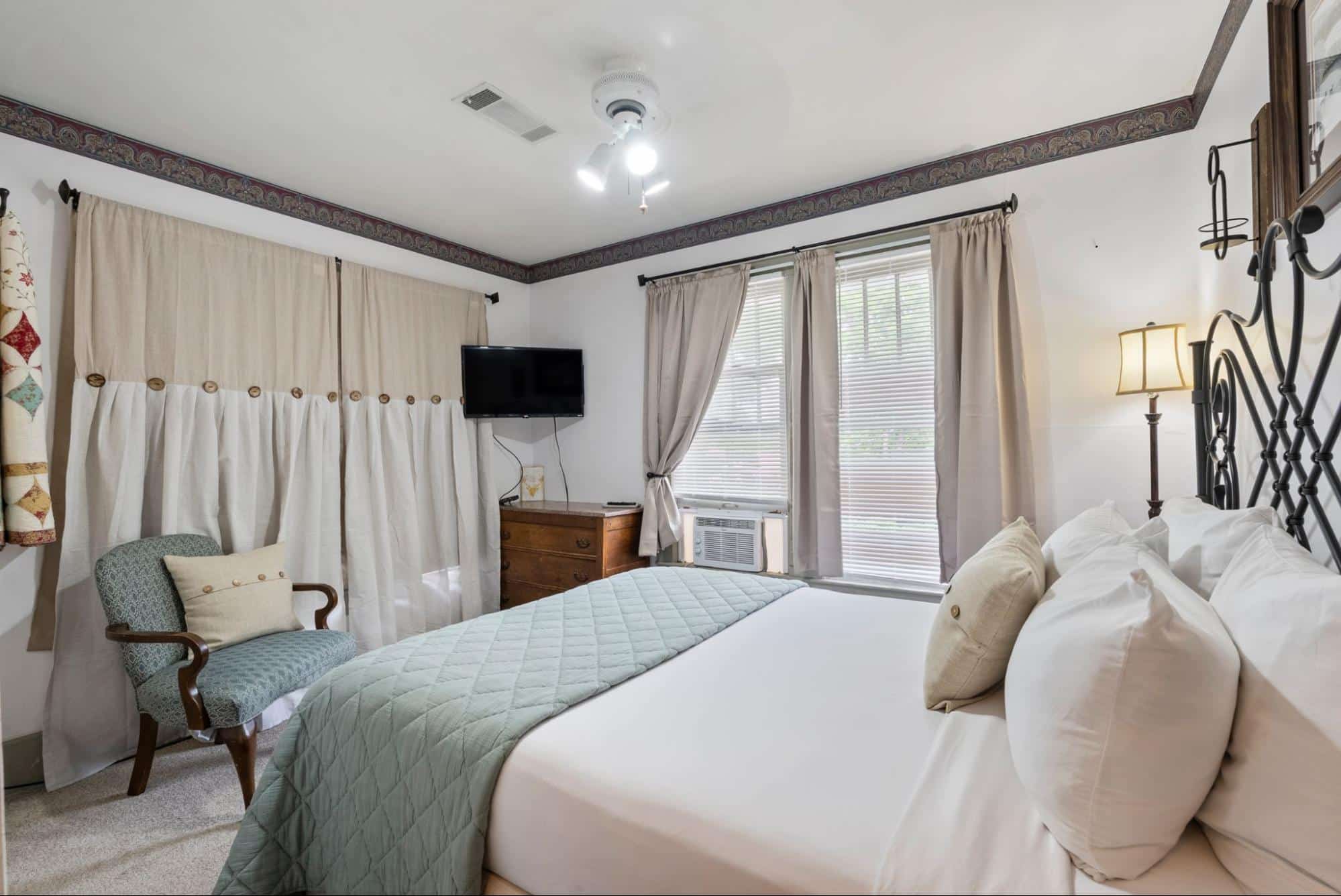 Common areas include the guest favorite large covered front porch with ample guest seating – the perfect location to pull up a comfortable rocking chair and listen to music being played across the street. The large dining room hosts the Inn’s guests for the wonderful fresh breakfast and the parlor provides guests with an extra sitting area and includes board games and even musical instruments to test your talents. Guest often return to the porch in between daily activities to recharge with a cup of coffee, a cold drink, or a freshly baked treat.