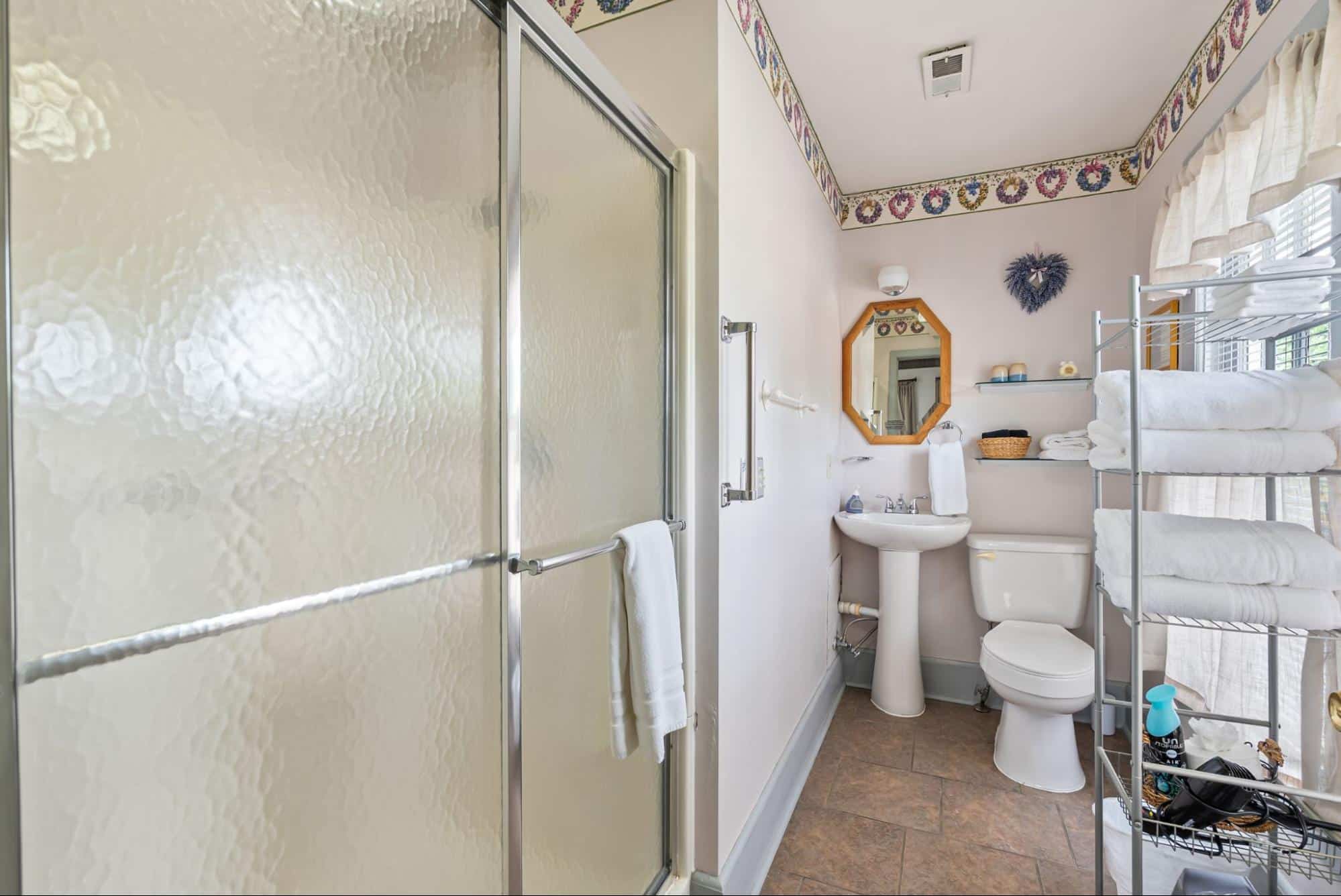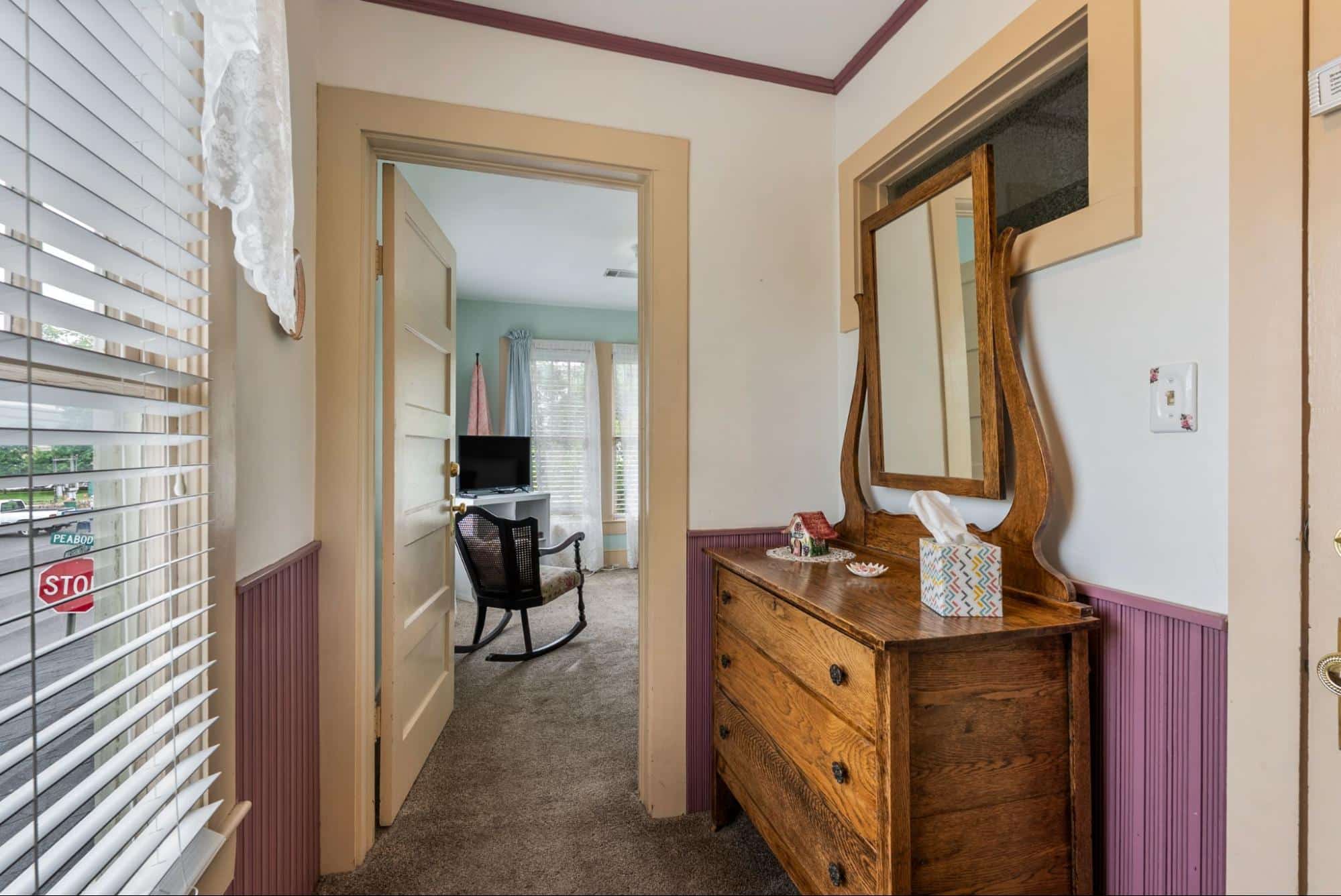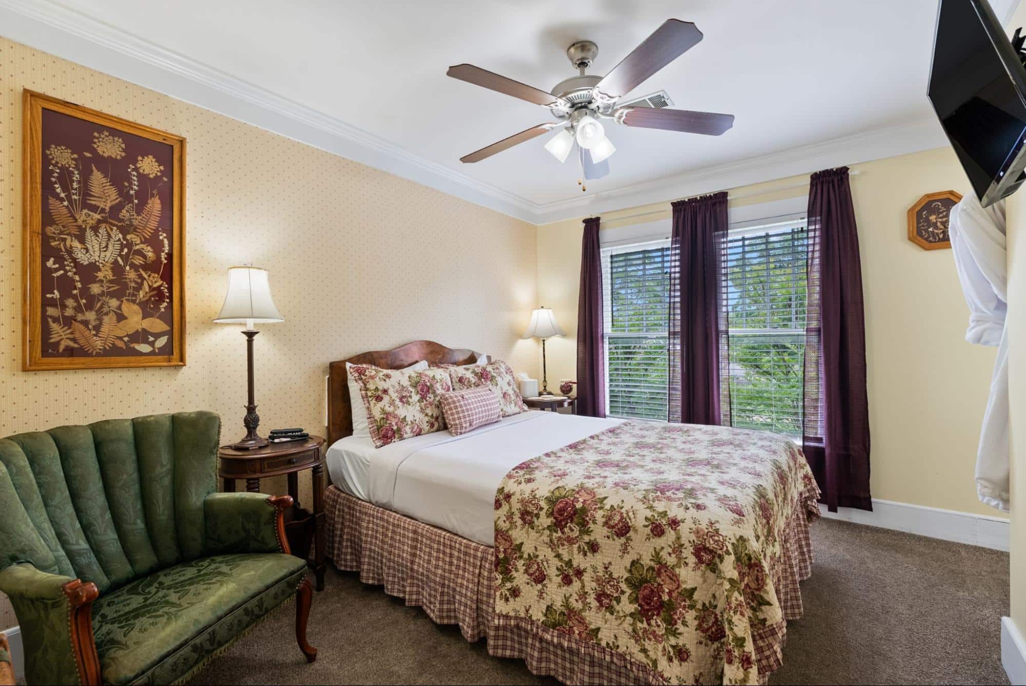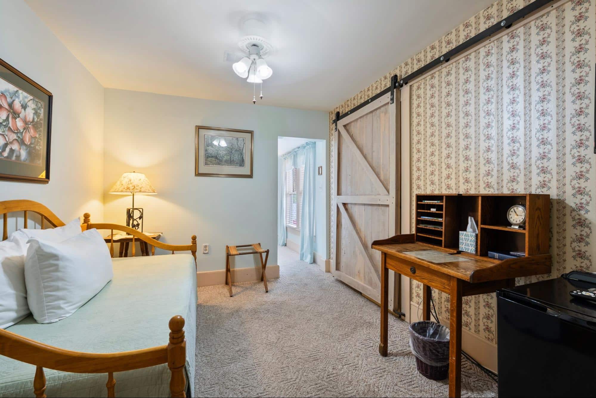 Common areas include the guest favorite large covered front porch with ample guest seating – the perfect location to pull up a comfortable rocking chair and listen to music being played across the street. The large dining room hosts the Inn’s guests for the wonderful fresh breakfast and the parlor provides guests with an extra sitting area and includes board games and even musical instruments to test your talents. Guest often return to the porch in between daily activities to recharge with a cup of coffee, a cold drink, or a freshly baked treat.