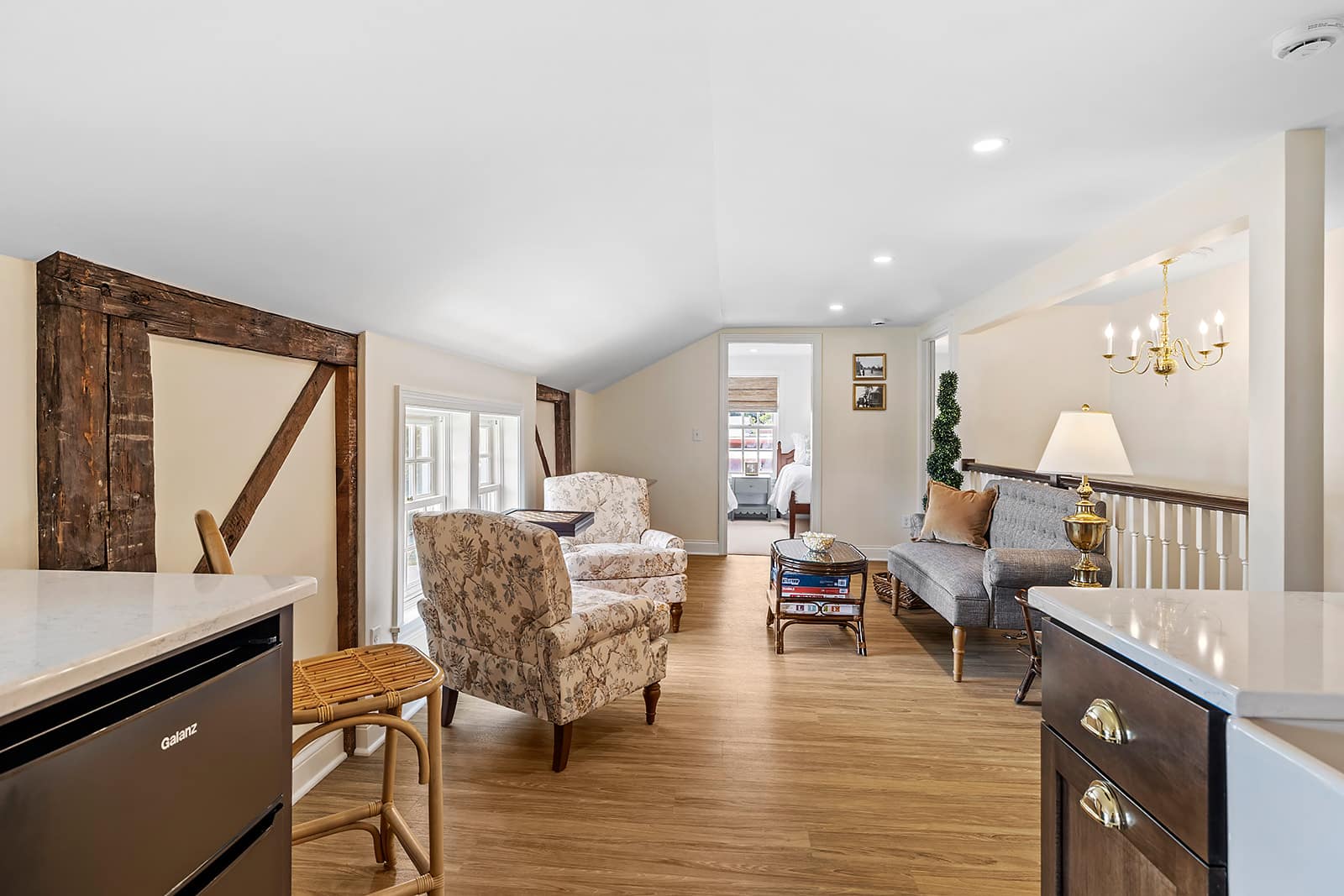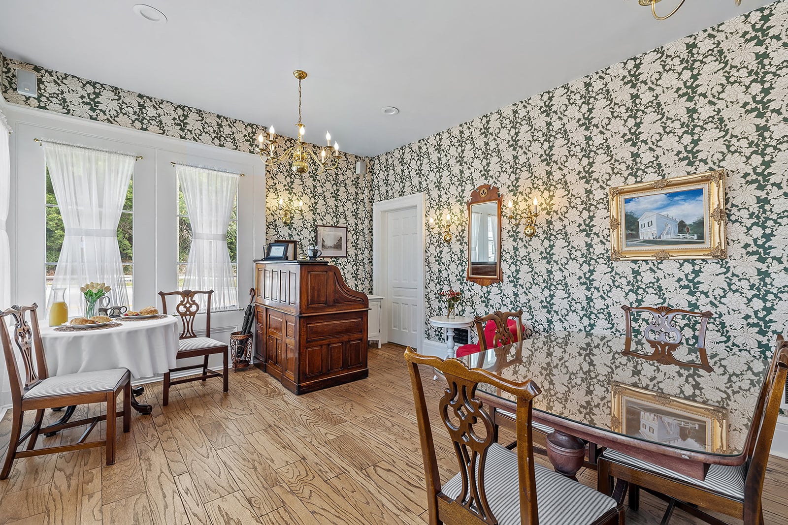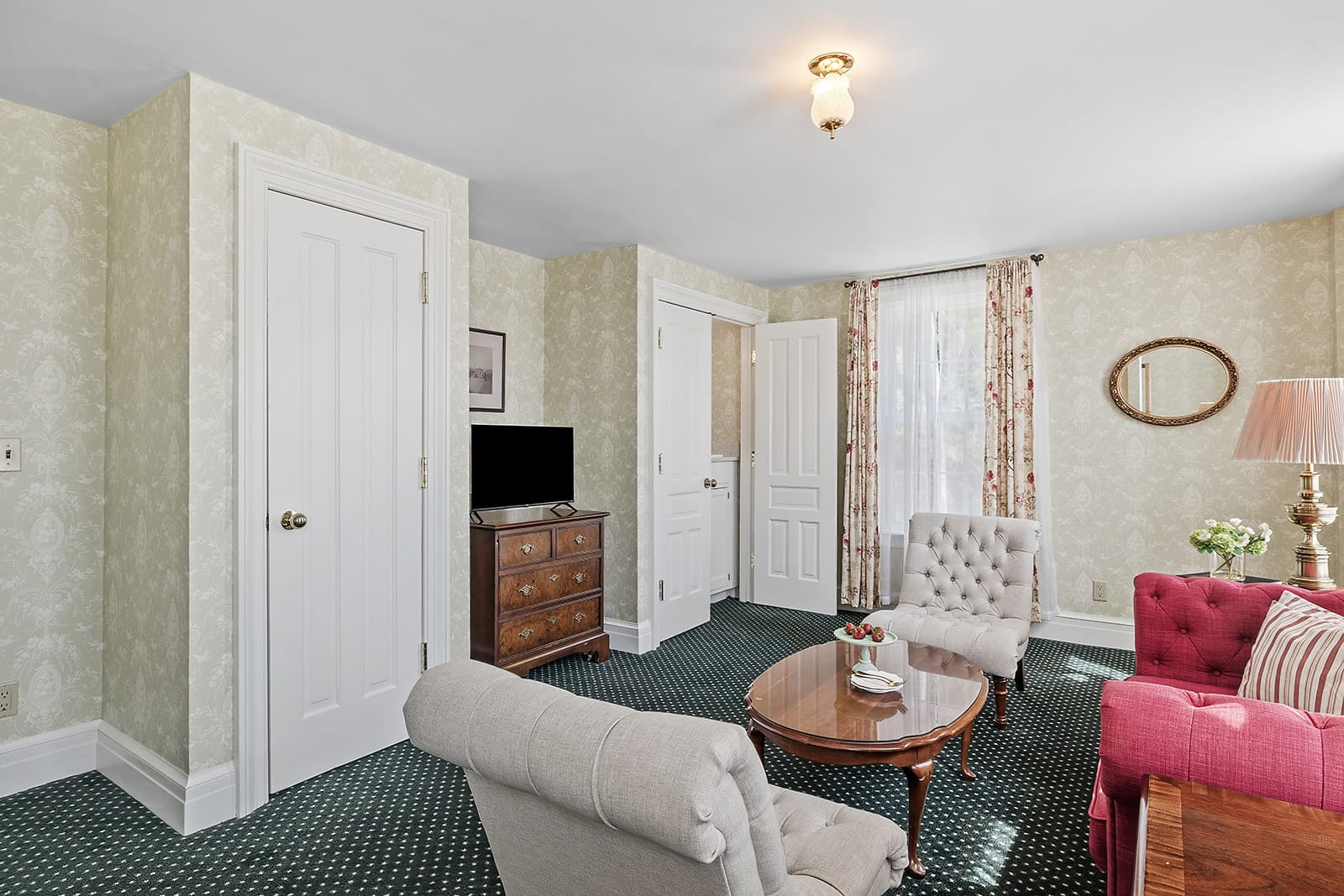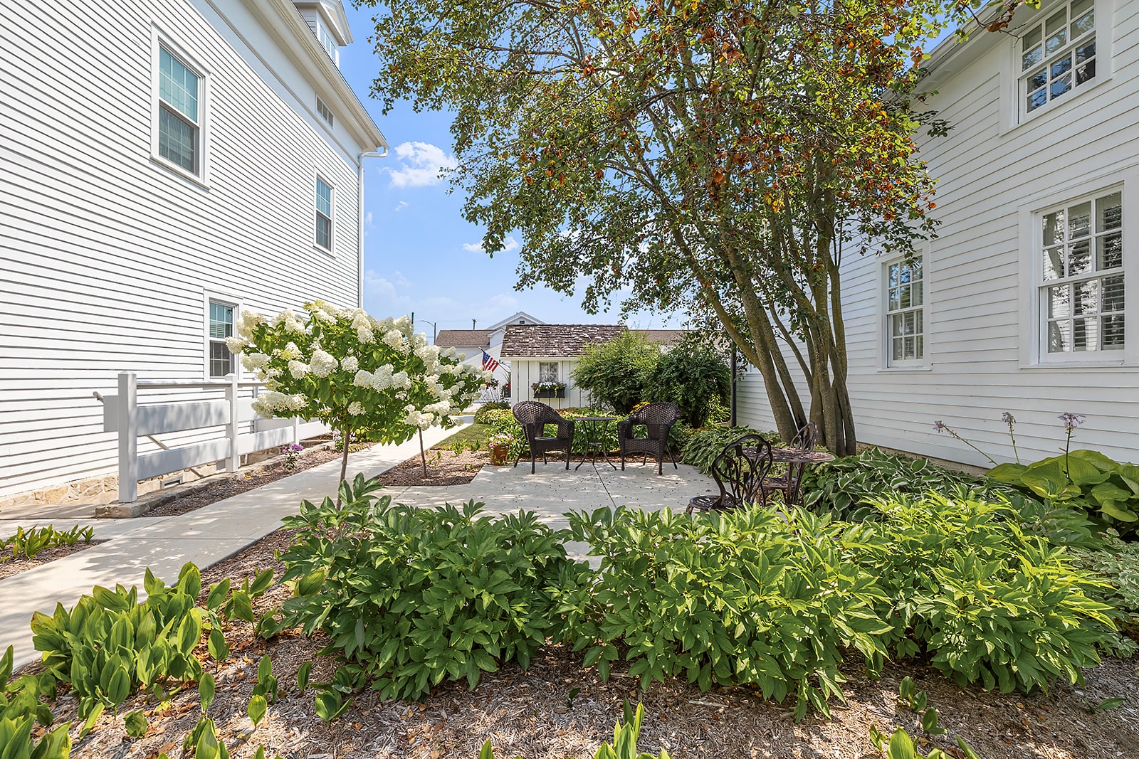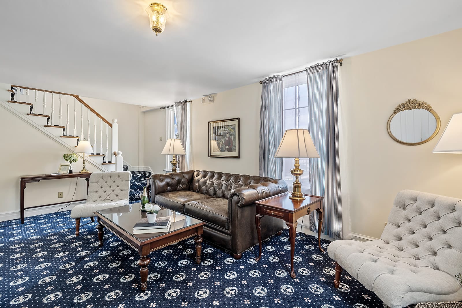 The Rochester Inn offers five luxury suites and one classic guest room, including four expansive two-story suites featuring first-floor sitting areas, wet bars, whirlpool tubs, and premium in-room amenities consistent with upscale boutique lodging standards. Common guest areas include a breakfast and sitting room adjacent to the commercial kitchen, while an exterior courtyard provides seasonal dining and social space. Six dedicated parking spaces transfer with the property.