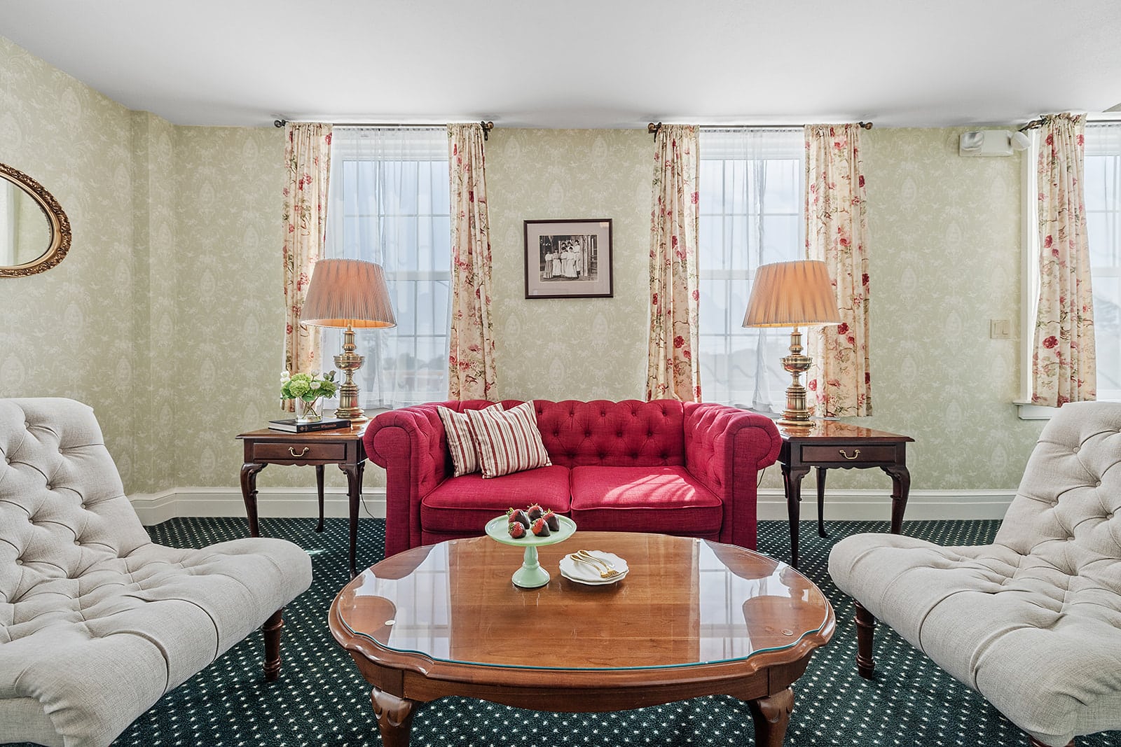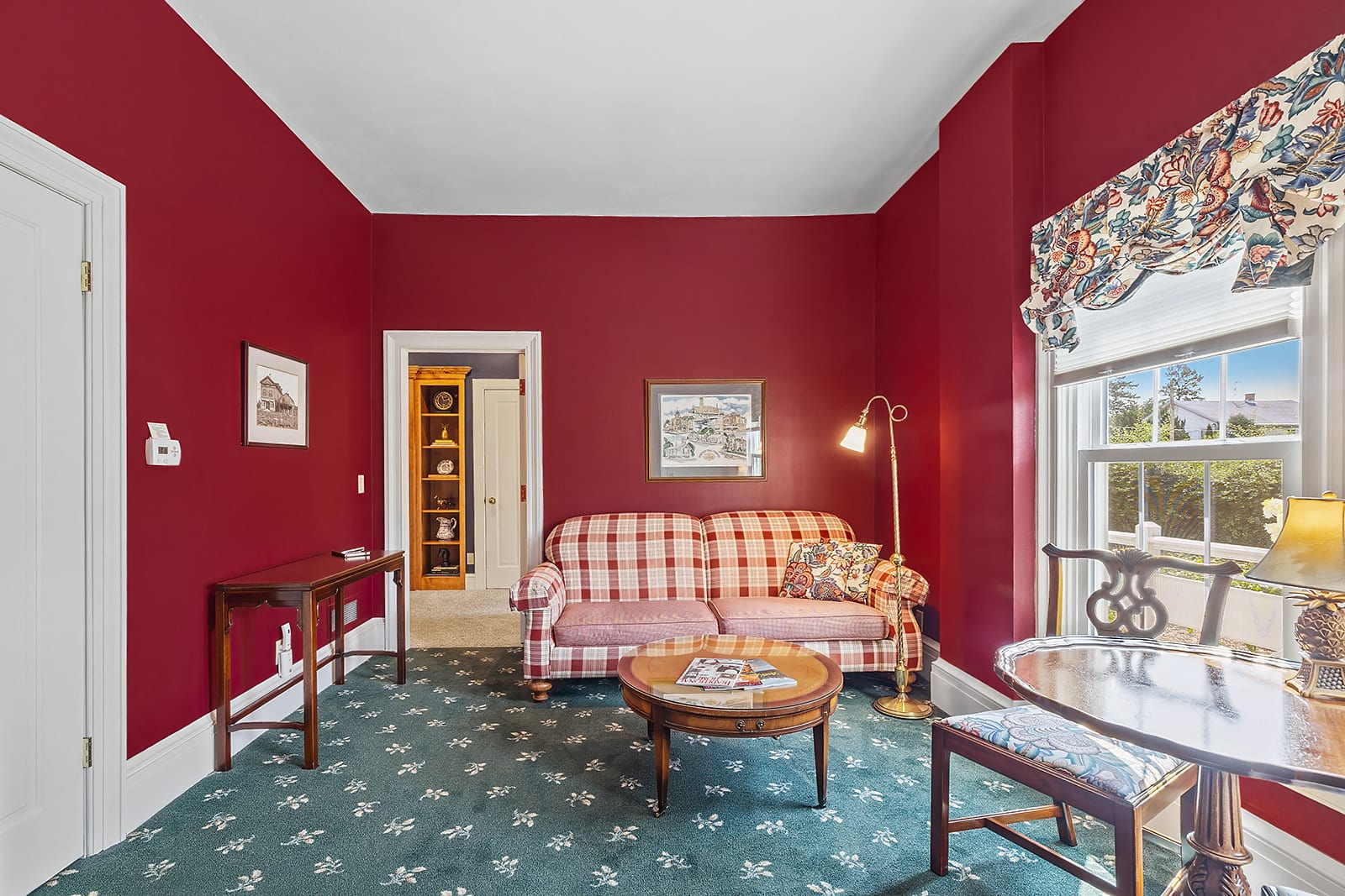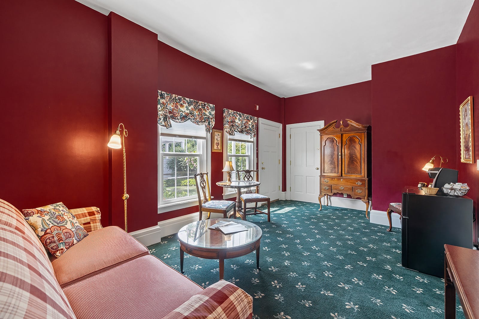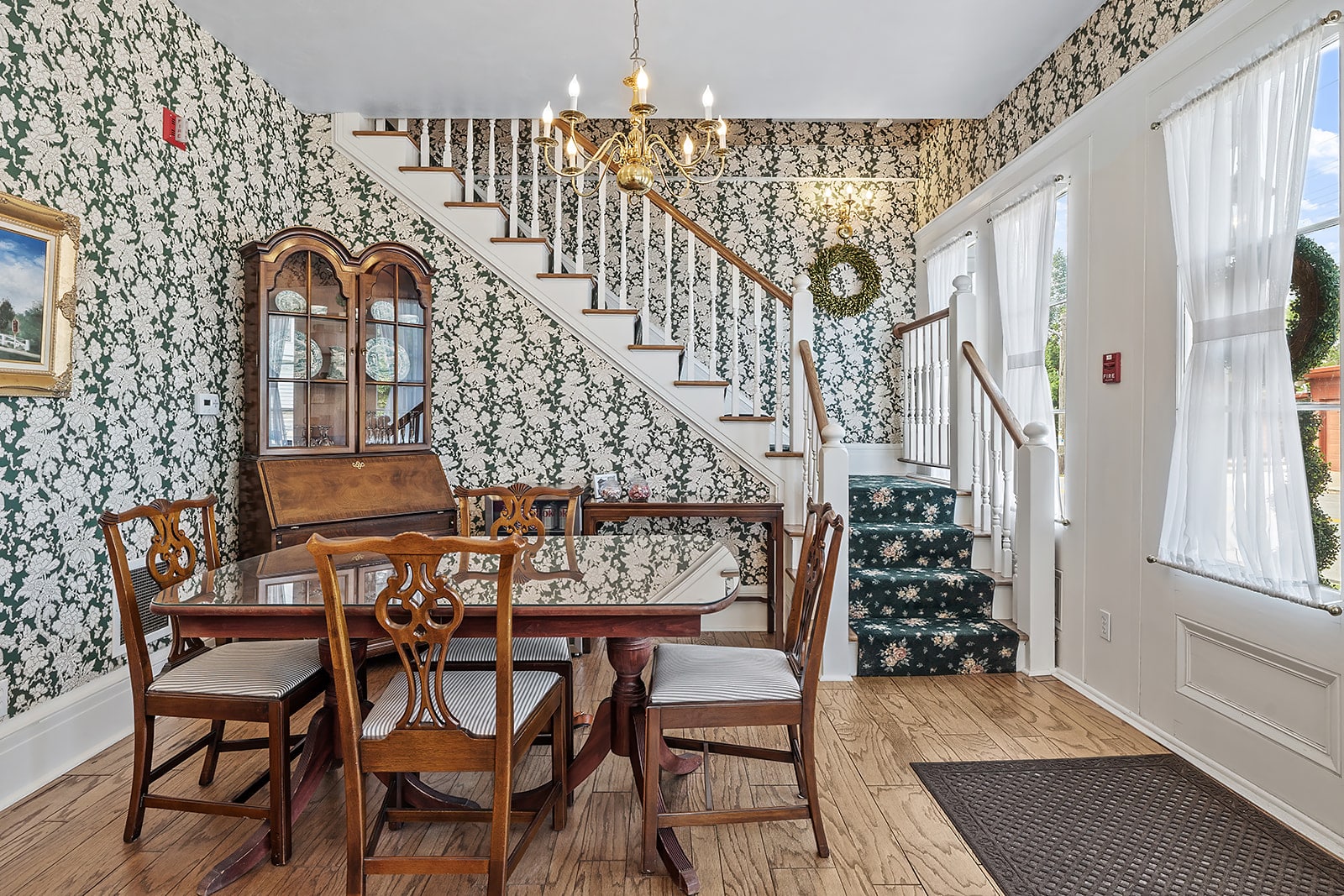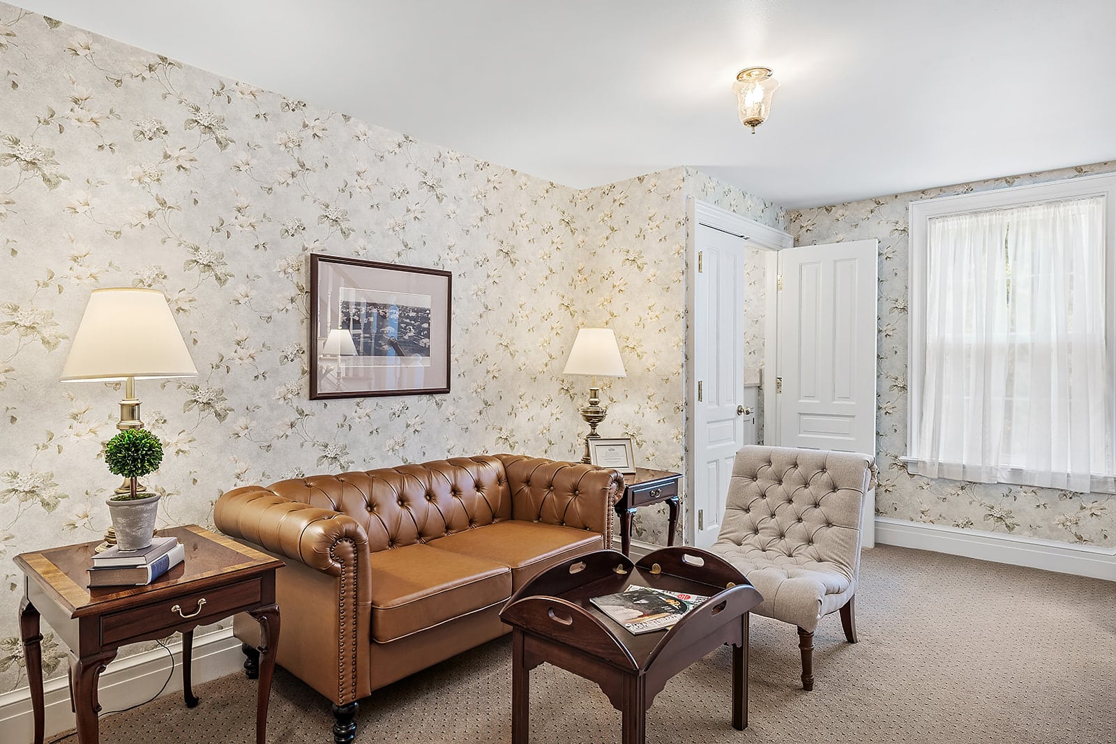 The Rochester Inn offers five luxury suites and one classic guest room, including four expansive two-story suites featuring first-floor sitting areas, wet bars, whirlpool tubs, and premium in-room amenities consistent with upscale boutique lodging standards. Common guest areas include a breakfast and sitting room adjacent to the commercial kitchen, while an exterior courtyard provides seasonal dining and social space. Six dedicated parking spaces transfer with the property.