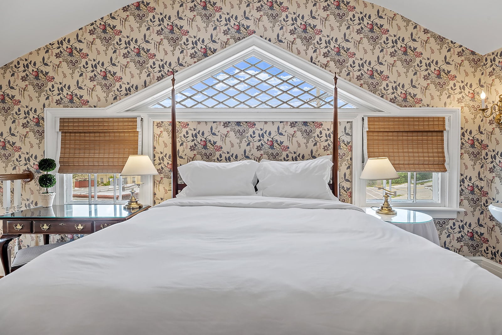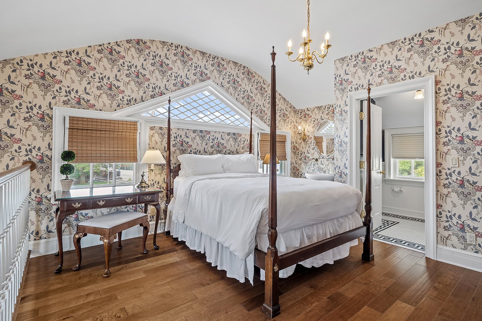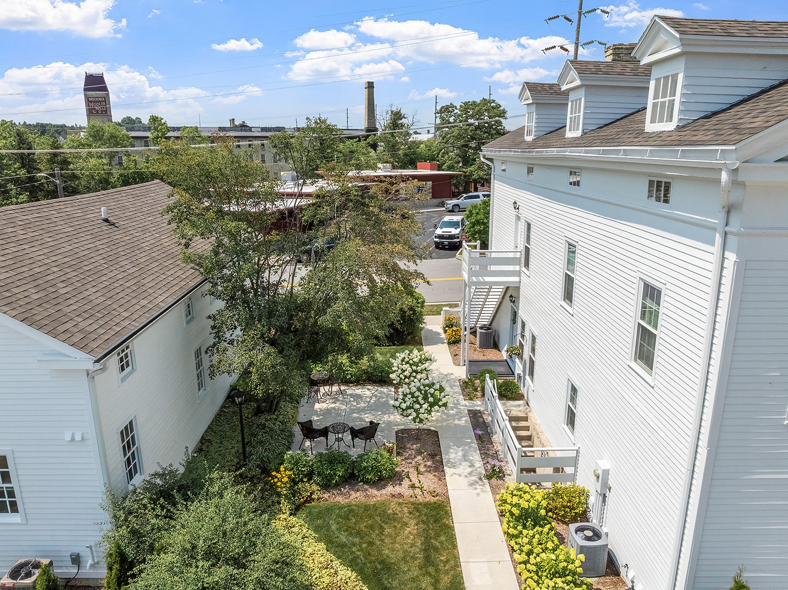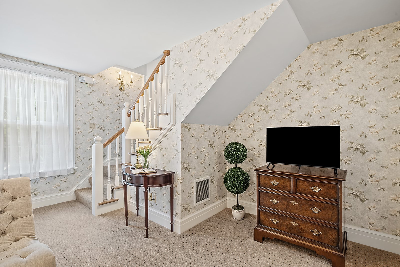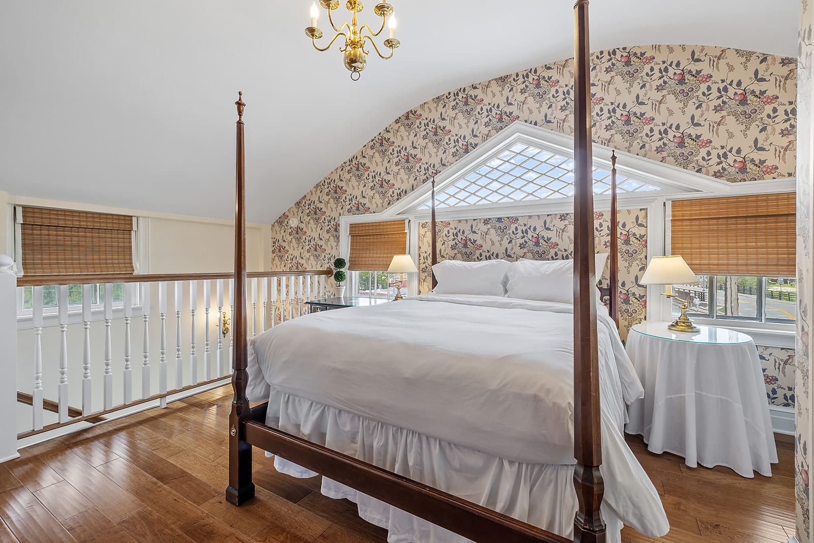 The Rochester Inn offers five luxury suites and one classic guest room, including four expansive two-story suites featuring first-floor sitting areas, wet bars, whirlpool tubs, and premium in-room amenities consistent with upscale boutique lodging standards. Common guest areas include a breakfast and sitting room adjacent to the commercial kitchen, while an exterior courtyard provides seasonal dining and social space. Six dedicated parking spaces transfer with the property.