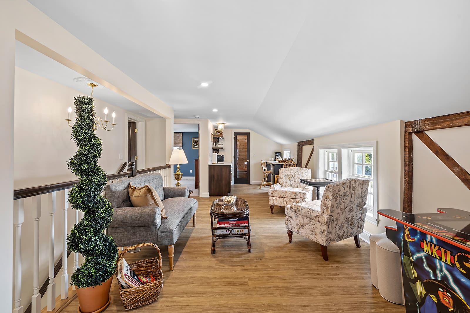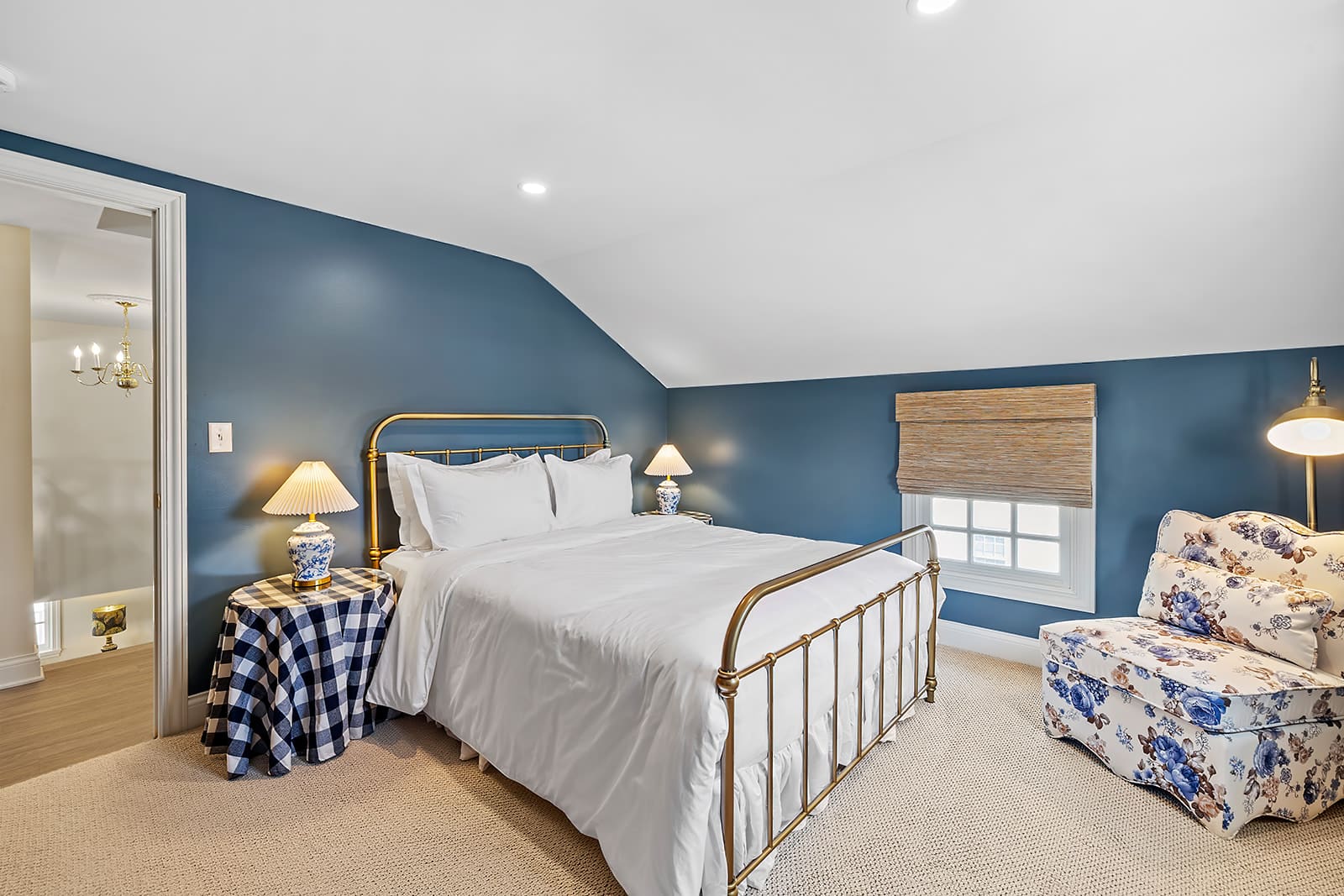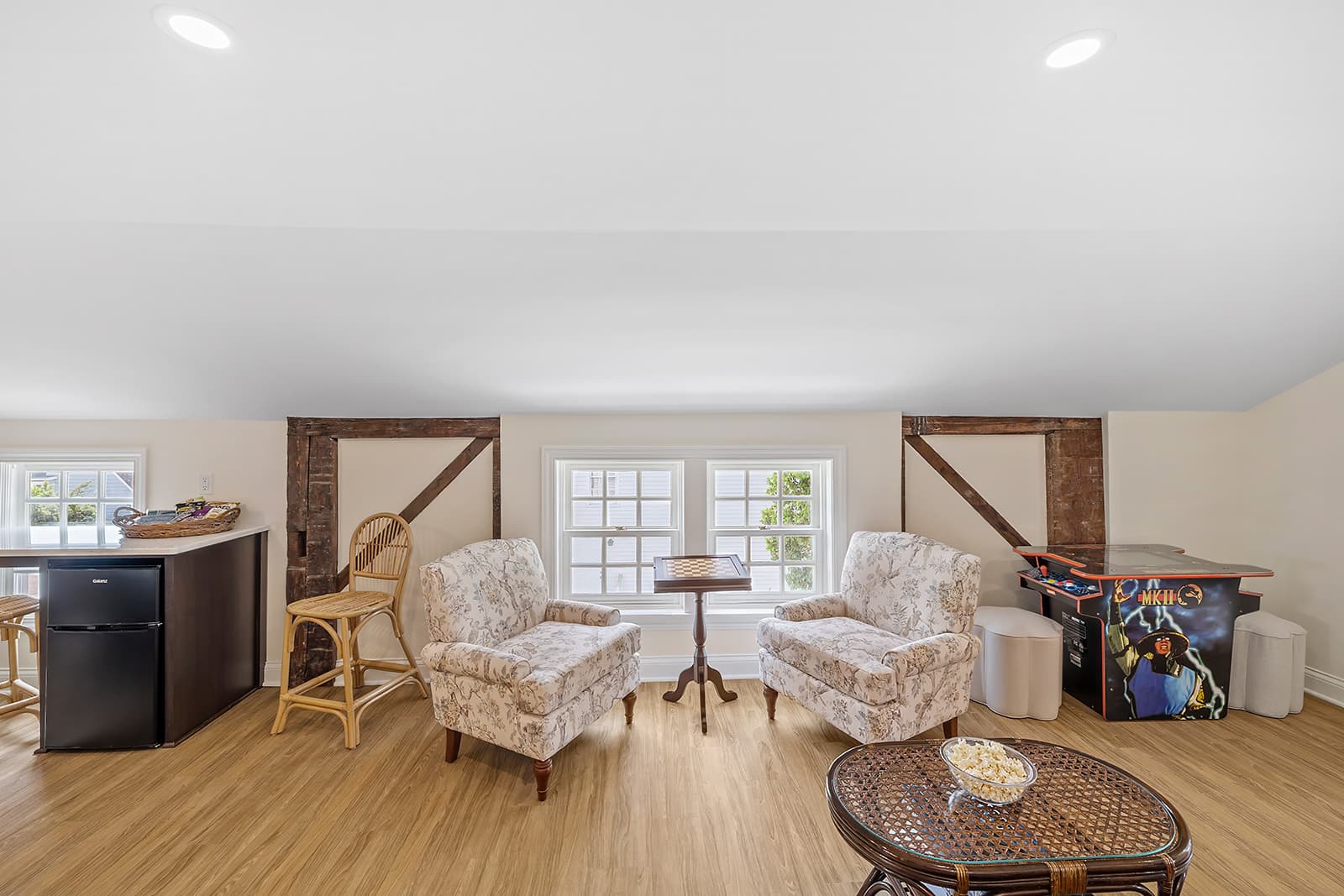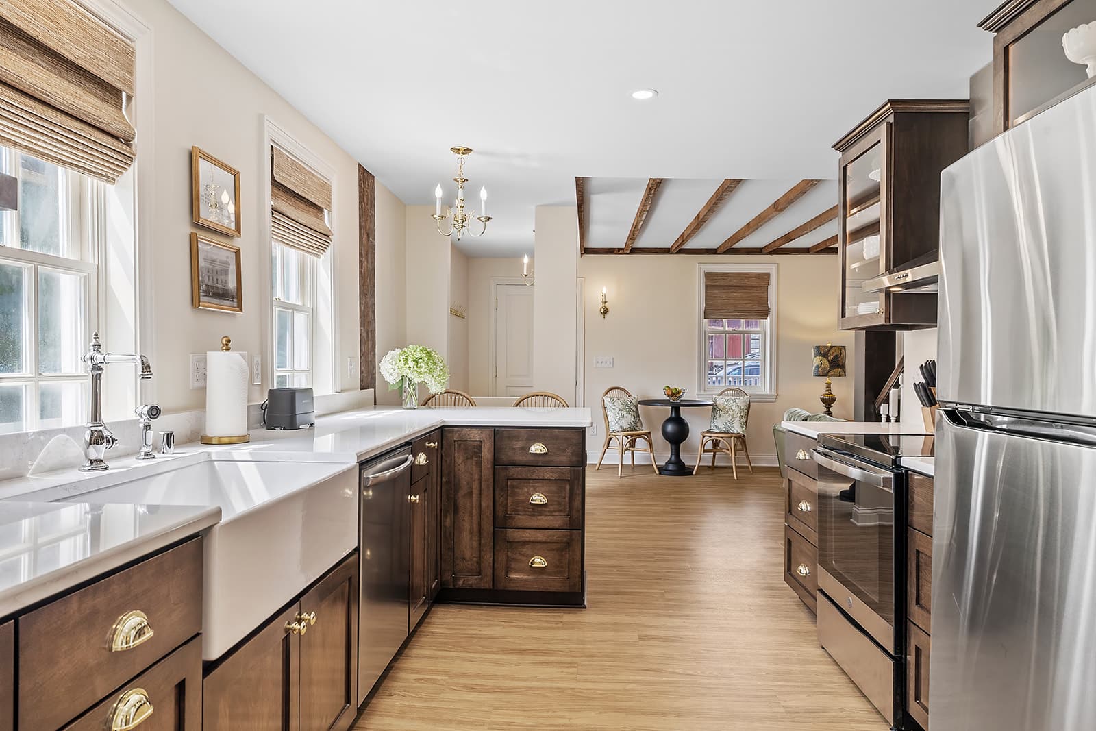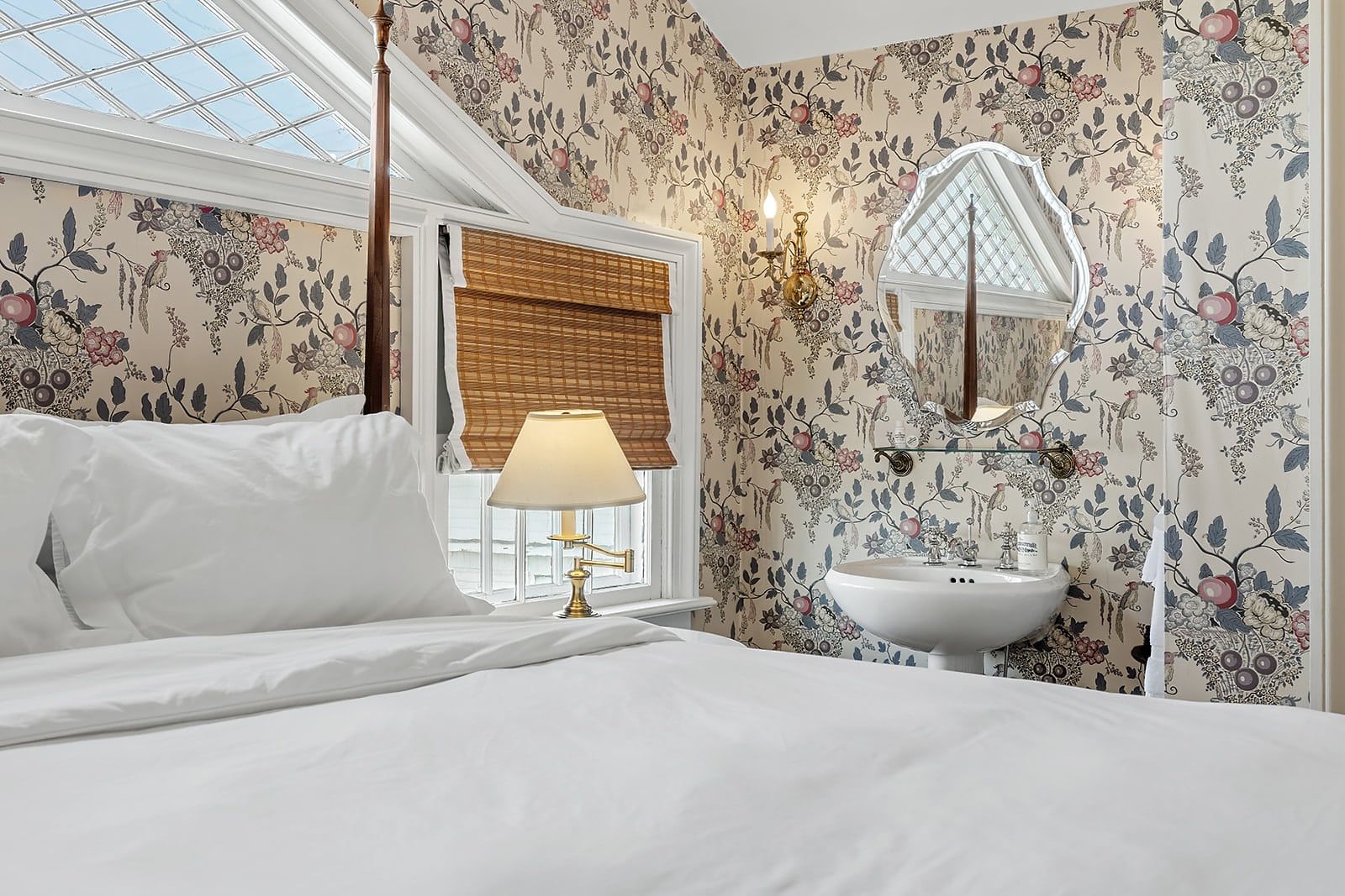 The Rochester Inn offers five luxury suites and one classic guest room, including four expansive two-story suites featuring first-floor sitting areas, wet bars, whirlpool tubs, and premium in-room amenities consistent with upscale boutique lodging standards. Common guest areas include a breakfast and sitting room adjacent to the commercial kitchen, while an exterior courtyard provides seasonal dining and social space. Six dedicated parking spaces transfer with the property.